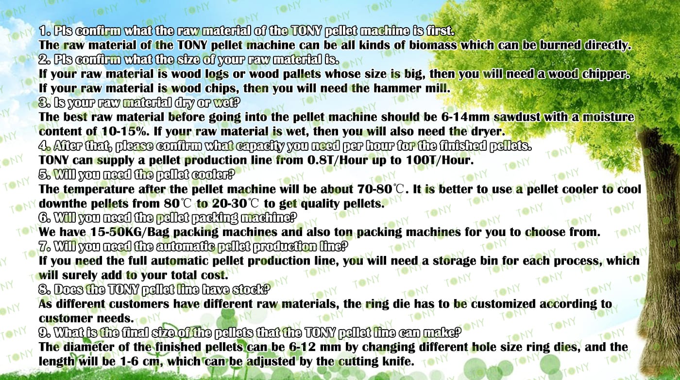 | Next, TONY Will Introduce To You All The Necessary Machinery That Will Be Used For The Whole Pellet Production Line. Some Machines Can Be Custom - Made By Customers According To Different Customers' Detailed Demands. Contact TONY For More Details, Including Quotation And Layout. | |||