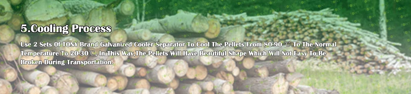 6. Main Equipment: Comprehensive Chipper TPC1400-700-250KW, Effective Hammer Mill-TFD85*250-250KW, Rotary Drum Dryer-2.5*24m, TONY Pellet Machine TYJ860-Ⅲ-250kw, Pellet Cooler, Ton Packing Machine and Belt Conveyors