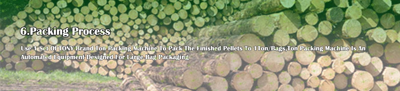6. Main Equipment: Comprehensive Chipper TPC1400-600-200KW, Effective Hammer Mill-TFD85*220-220KW,Rotary Drum Dryer-2.2*24m, TONY Pellet Machine TYJ760-Ⅲ-160KW, Pellet Cooler, Ton Packing Machine and Belt Conveyors