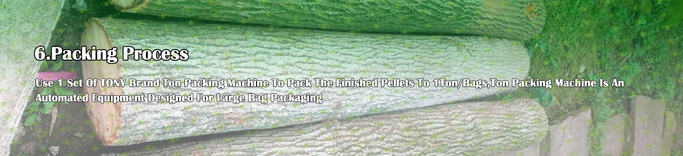6. Main Equipment: Comprehensive Chipper TPC1400-700-250KW, Effective Hammer Mill-TFD85*250-250KW, Rotary Drum Dryer-2.5*24m, TONY Pellet Machine TYJ760-Ⅲ-200KW, Pellet Cooler, Ton Packing Machine and Belt Conveyors