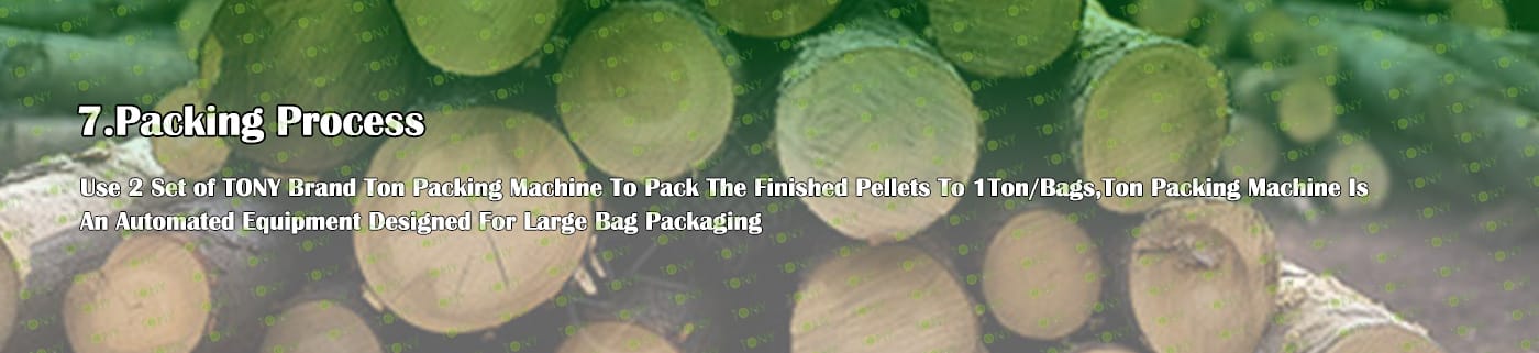 6. Main Equipment: Comprehensive Chipper TPC1300-600-160KW, Effective Hammer Mill-TFD75*132-132KW, TONY Large Hydraulic Storage Silo,Rotary Drum Dryer-3*24m, TONY Pellet Machine TYJ860 - Ⅲ - 280kw, Pellet Cooler, Ton Packing Machine and Belt Conveyors