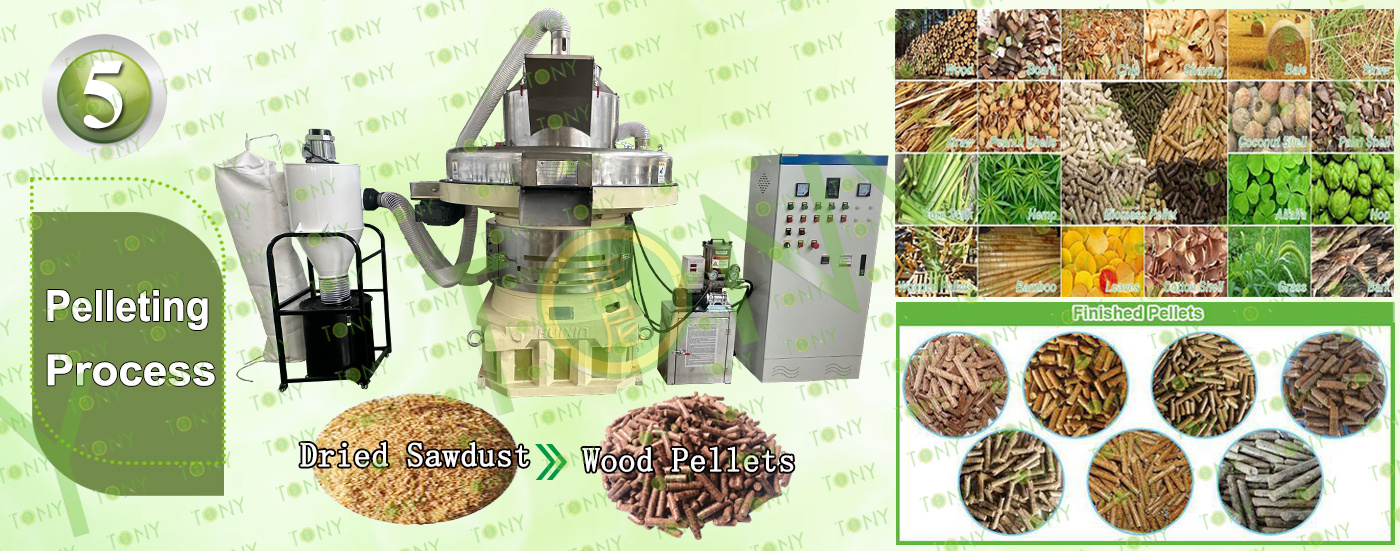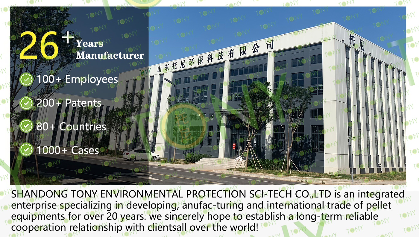 4.Main Machine: Comprehensive Chipper,Hammer Mill, Large Hydraulic Storage Silo, Rotary Drum Dryer,TONY Pellet MachineTYJ860-III-280KW,Pellets Cooler,Packing Machine And Belt Conveyors