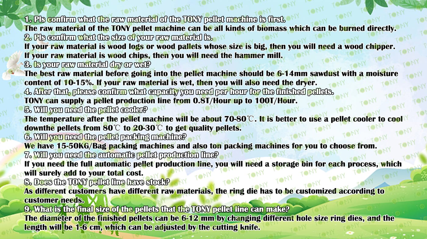 | Next, TONY Will Introduce To You All The Necessary Machinery That Will Be Used For The Whole Pellet Production Line. Some Machines Can Be Custom - Made By Customers According To Different Customers' Detailed Demands. Contact TONY For More Details, Including Quotation And Layout. | |||