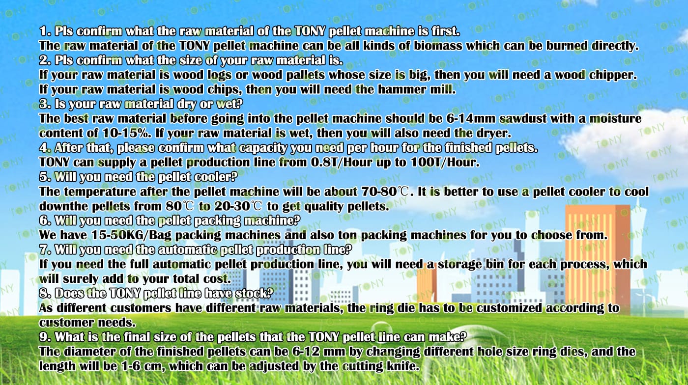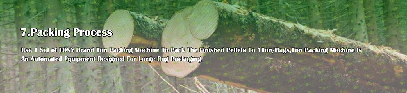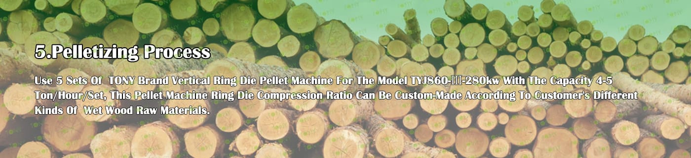 6. Main Equipment: Comprehensive Chipper TPC1300-1600-160KW, Effective Hammer Mill-TFD75*160-160KW, TONY Large Hydraulic Storage Silo,Rotary Drum Dryer-2.2*24m, TONY Pellet Machine TYJ860-Ⅲ-280KW, Pellet Cooler, Ton Packing Machine and Belt Conveyors