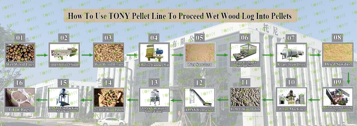 How to use the TONY pellet production line to make pellets from wet wood Log? The process mainly includes the following steps and equipment: 1. Use TONY comprehensive chipper to cut wet wood log with a diameter of less than 35 cm into wood chips 25 - 55 mm in length. 2. Use TONY effective hammer mill to crush the 25-55 mm wood chips into 8-14 mm sawdust. 3.Use TONY large hydraulic storage silo to storage 8-14 mm sawdust 4. Use TONY rotary drum dryer to dry the sawdust with a 40% moisture content down to a moisture content of 10%-15%. 5. Use TONY vertical ring die pellet machine to produce pellets with a diameter of 6-8 mm. 6. Use TONY galvanized cooler to cool the pellets from 80-90°C to 20-30°C. 7. Use TONY ton packing machine to pack the pellets into bags, each weighing 1ton. For more detailed information and quotations, you can contact TONY. TONY can provide all the above - mentioned products at highly competitive prices and with excellent quality. |