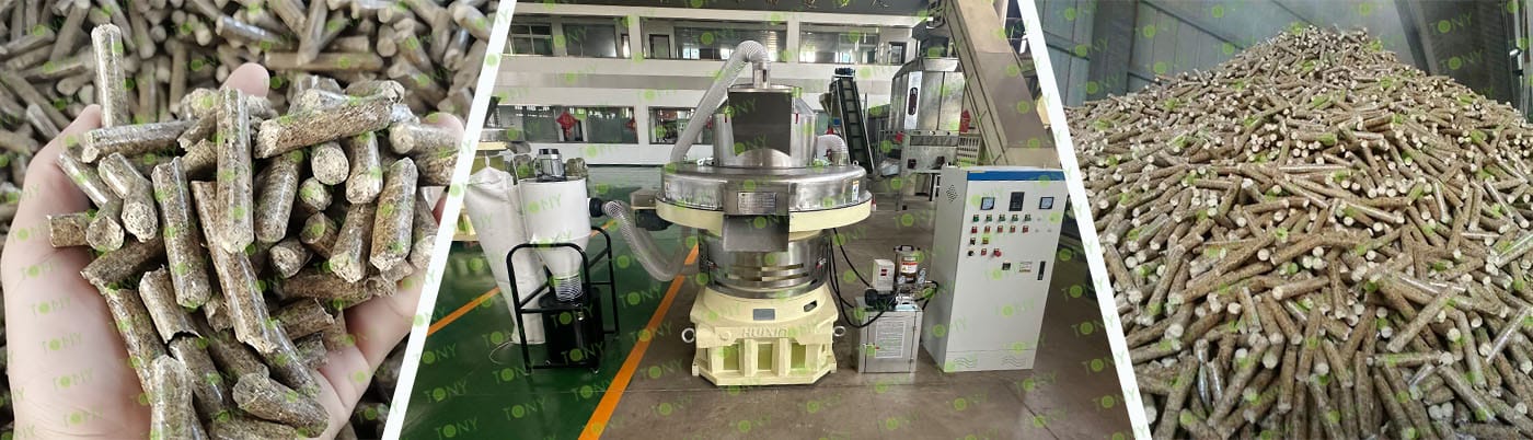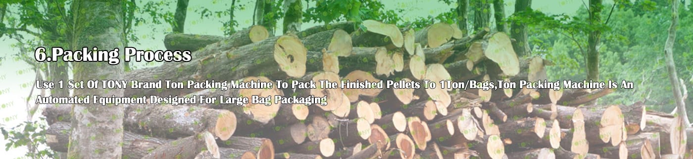 6. Main Equipment: Comprehensive Chipper TPC1300-600-160KW, Effective Hammer Mill-TFD75*160-160KW,Rotary Drum Dryer-1.8*24m, TONY Pellet Machine TYJ860-Ⅲ-250KW, Pellet Cooler, Ton Packing Machine and Belt Conveyors