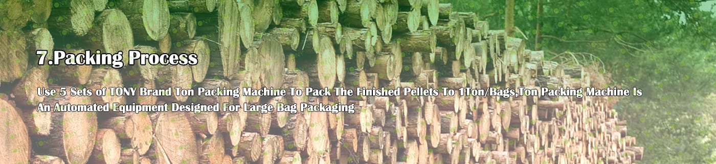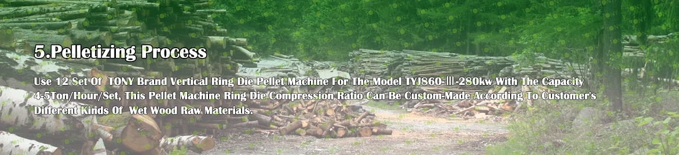 6. Main Equipment: Comprehensive Chipper TPC1600-1000-315KW, Effective Hammer Mill-TFD120*200-355KW, TONY Large Hydraulic Storage Silo,Rotary Drum Dryer-3.2*28m, TONY Pellet Machine TYJ860 - Ⅲ - 280kw, Pellet Cooler, Ton Packing Machine and Belt Conveyors