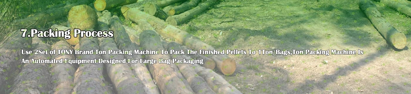 6. Main Equipment: Comprehensive Chipper TPC1600-1000-315KW, Effective Hammer Mill-TFD120*200-355KW, TONY Large Hydraulic Storage Silo,Rotary Drum Dryer-3.2*28m, TONY Pellet Machine TYJ860-Ⅲ-280KW, Pellet Cooler, Ton Packing Machine and Belt Conveyors