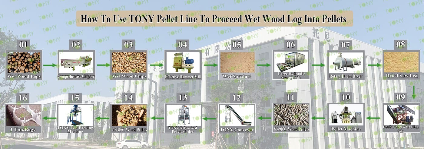 How to use the TONY pellet production line to make pellets from wet wood Log? The process mainly includes the following steps and equipment: 1. Use TONY comprehensive chipper to cut wet wood log with a diameter of less than 40 cm into wood chips 25 - 55 mm in length. 2. Use TONY effective hammer mill to crush the 25-55 mm wood chips into 8-14 mm sawdust. 3.Use TONY large hydraulic storage silo to storage 8-14 mm sawdust 4. Use TONY rotary drum dryer to dry the sawdust with a 40% moisture content down to a moisture content of 10%-15%. 5. Use TONY vertical ring die pellet machine to produce pellets with a diameter of 6-8 mm. 6. Use TONY galvanized cooler to cool the pellets from 80-90°C to 20-30°C. 7. Use TONY ton packing machine to pack the pellets into bags, each weighing 1ton. For more detailed information and quotations, you can contact TONY. TONY can provide all the above - mentioned products at highly competitive prices and with excellent quality. |