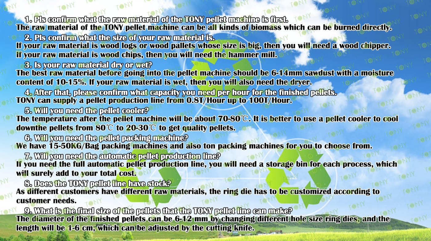 Next, TONY Will Introduce To You All The Necessary Machinery That Will Be Used For The Whole Pellet Production Line. Some Machines Can Be Custom - Made By Customers According To Different Customers' Detailed Demands. Contact TONY For More Details, Including Quotation And Layout. |