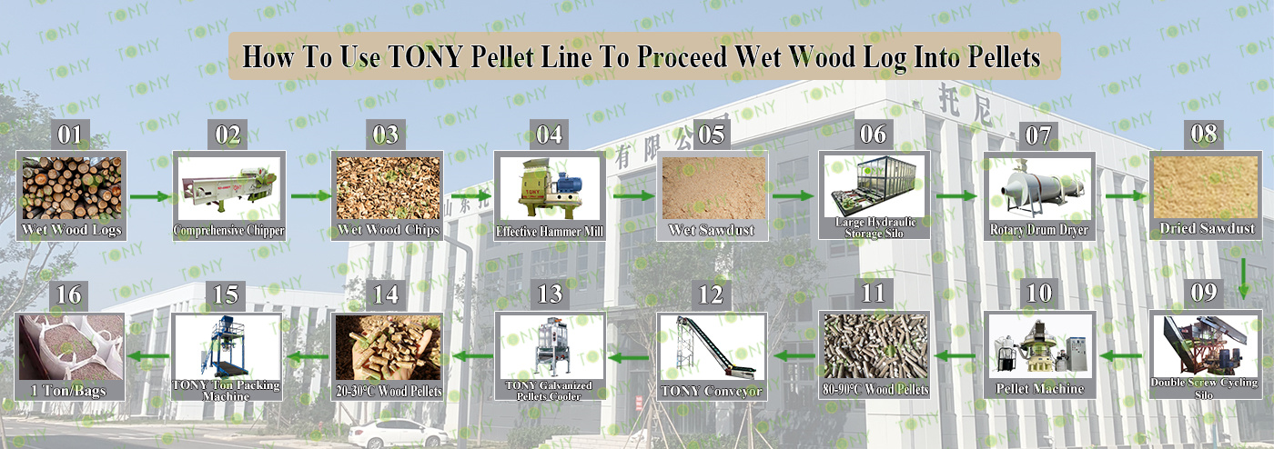 How to use the TONY pellet production line to make pellets from wet wood Log? The process mainly includes the following steps and equipment: 1. Use TONY comprehensive chipper to cut wet wood log with a diameter of less than 30 cm into wood chips 25 - 55 mm in length. 2. Use TONY effective hammer mill to crush the 25-55 mm wood chips into 8-14 mm sawdust. 3.Use TONY large hydraulic storage silo to storage 8-14 mm sawdust 4. Use TONY rotary drum dryer to dry the sawdust with a 40% moisture content down to a moisture content of 10%-15%. 5. Use TONY vertical ring die pellet machine to produce pellets with a diameter of 6-8 mm. 6. Use TONY galvanized cooler to cool the pellets from 80-90°C to 20-30°C. 7. Use TONY ton packing machineto pack the pellets into bags, each weighing 1 ton. For more detailed information and quotations, you can contact TONY. TONY can provide all the above - mentioned products at highly competitive prices and with excellent quality. |