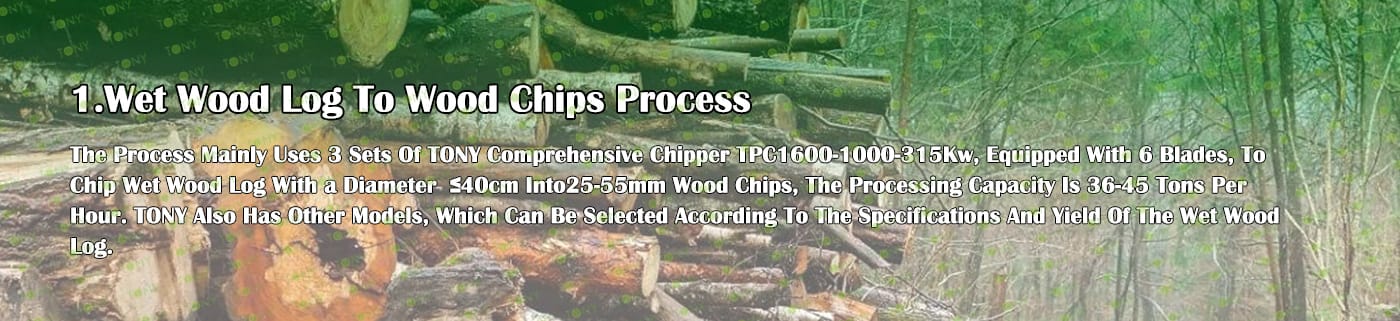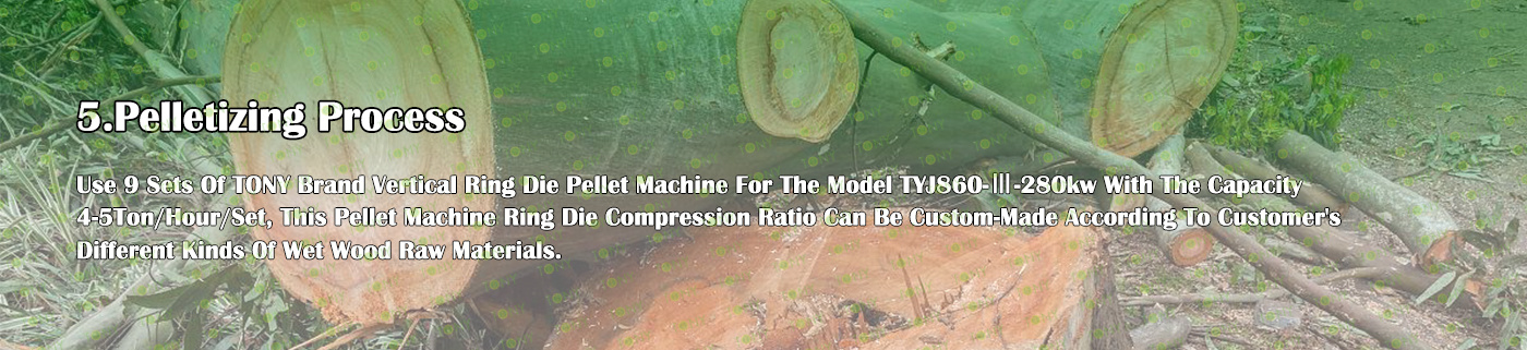 6. Main Equipment: Comprehensive Chipper TPC1600-1000-315KW, Effective Hammer Mill-TFD100*200-315KW, TONY Large Hydraulic Storage Silo,Rotary Drum Dryer-3.2*24m, TONY Pellet Machine TYJ860-Ⅲ-280KW, Pellet Cooler, Ton Packing Machine and Belt Conveyors