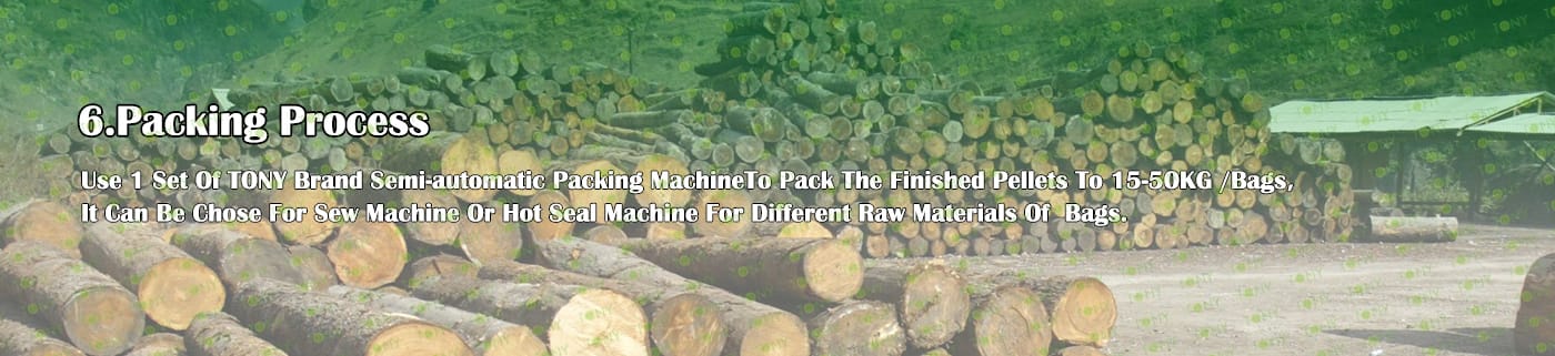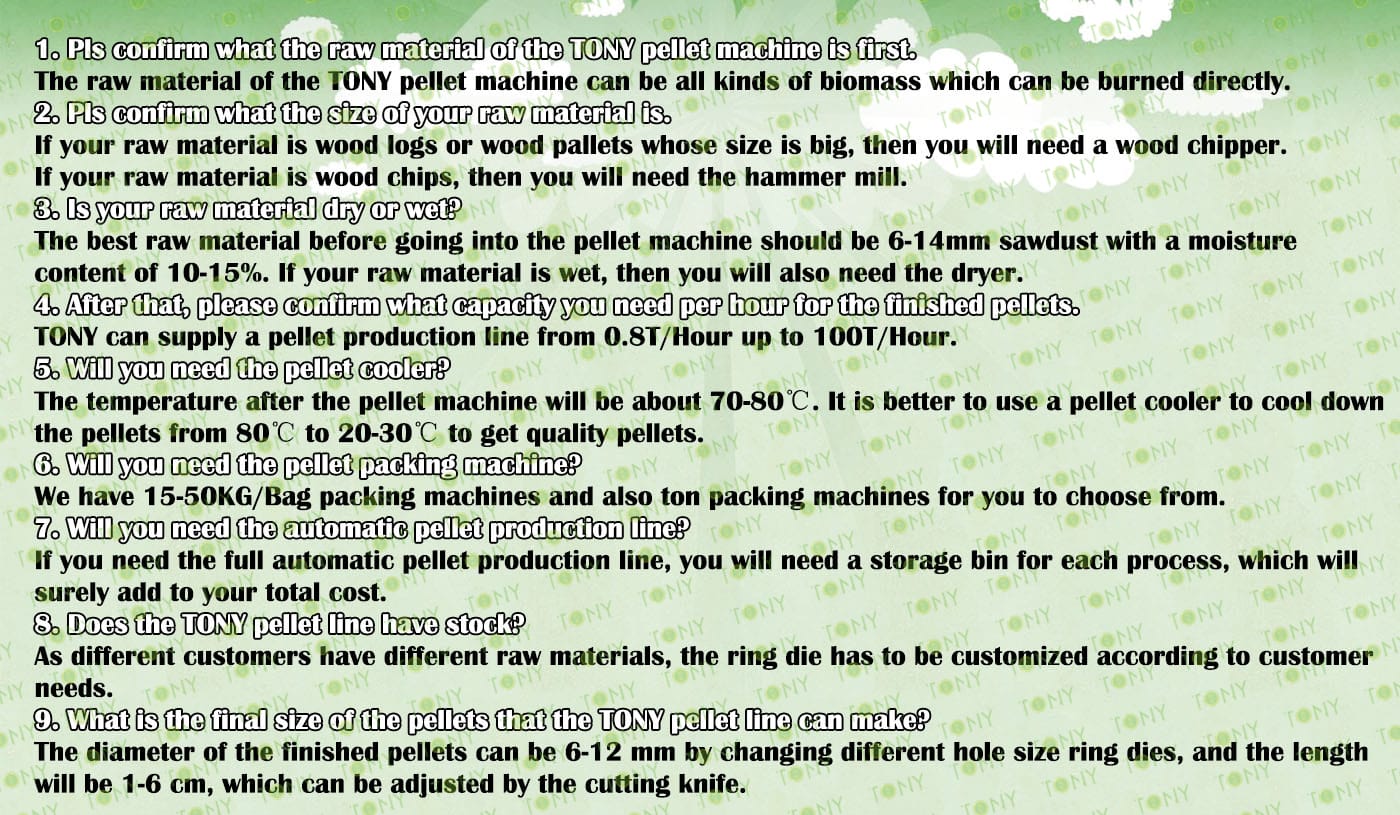 6. Main Equipment: Wood Chipper TPQ216 - 55KW, Multifunctional Hammer Mill-TFQ65*55-37kw, Rotary Drum Dryer-1.2*12m, TONY Pellet Machine TYJ450-II-55KW, Pellet Cooler, Small Packing Machine and Belt Conveyors