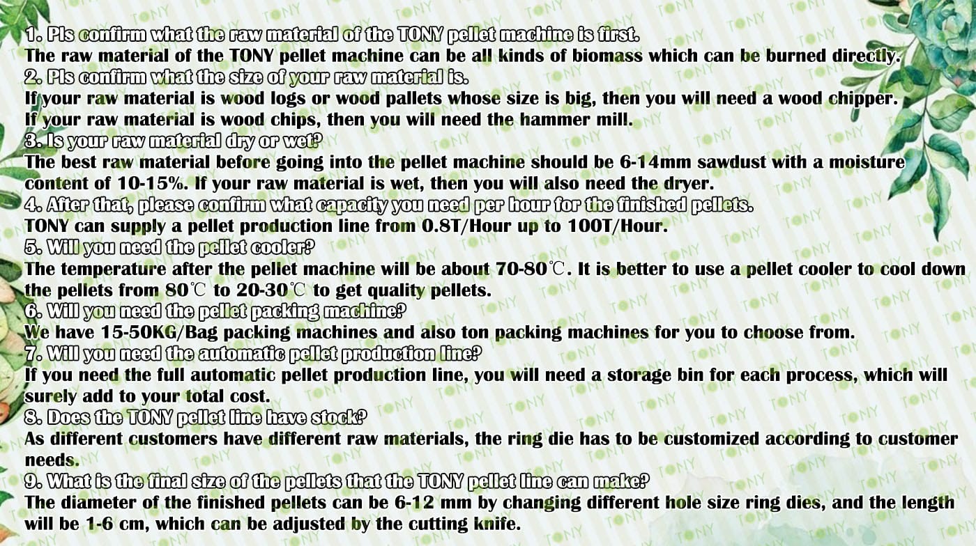 | Next, TONY Will Introduce To You All The Necessary Machinery That Will Be Used For The Whole Pellet Production Line. Some Machines Can Be Custom - Made By Customers According To Different Customers' Detailed Demands. Contact TONY For More Details, Including Quotation And Layout. | ||