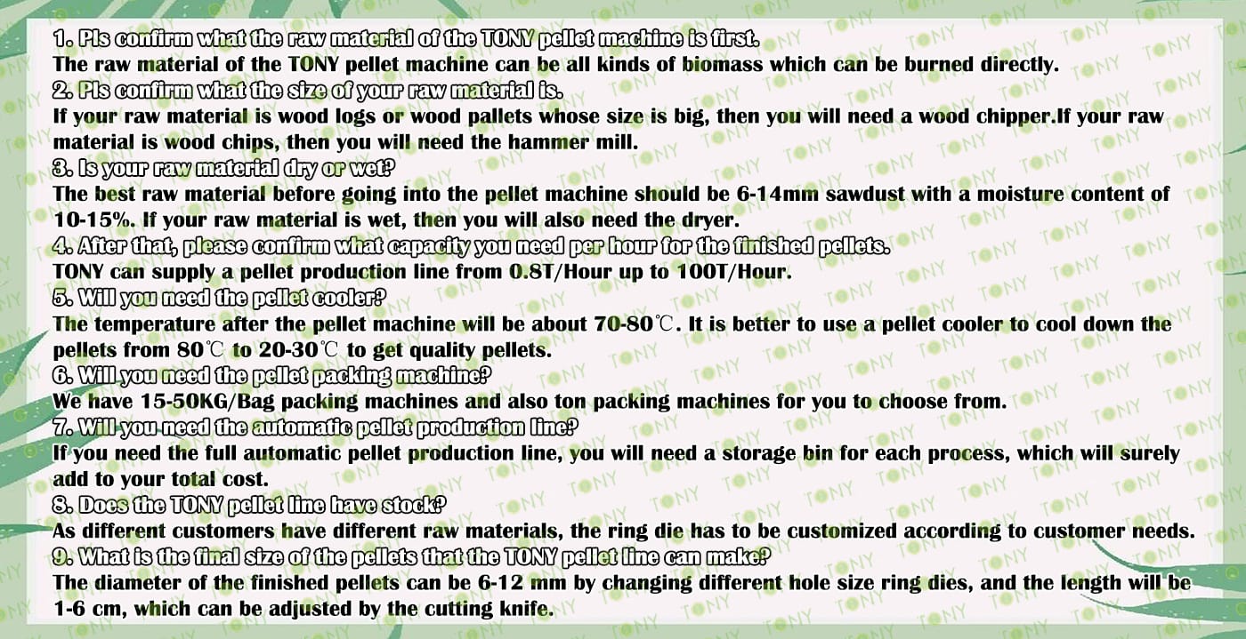 | Next, TONY Will Introduce To You All The Necessary Machinery That Will Be Used For The Whole Pellet Production Line. Some Machines Can Be Custom - Made By Customers According To Different Customers' Detailed Demands. Contact TONY For More Details, Including Quotation And Layout. | |||