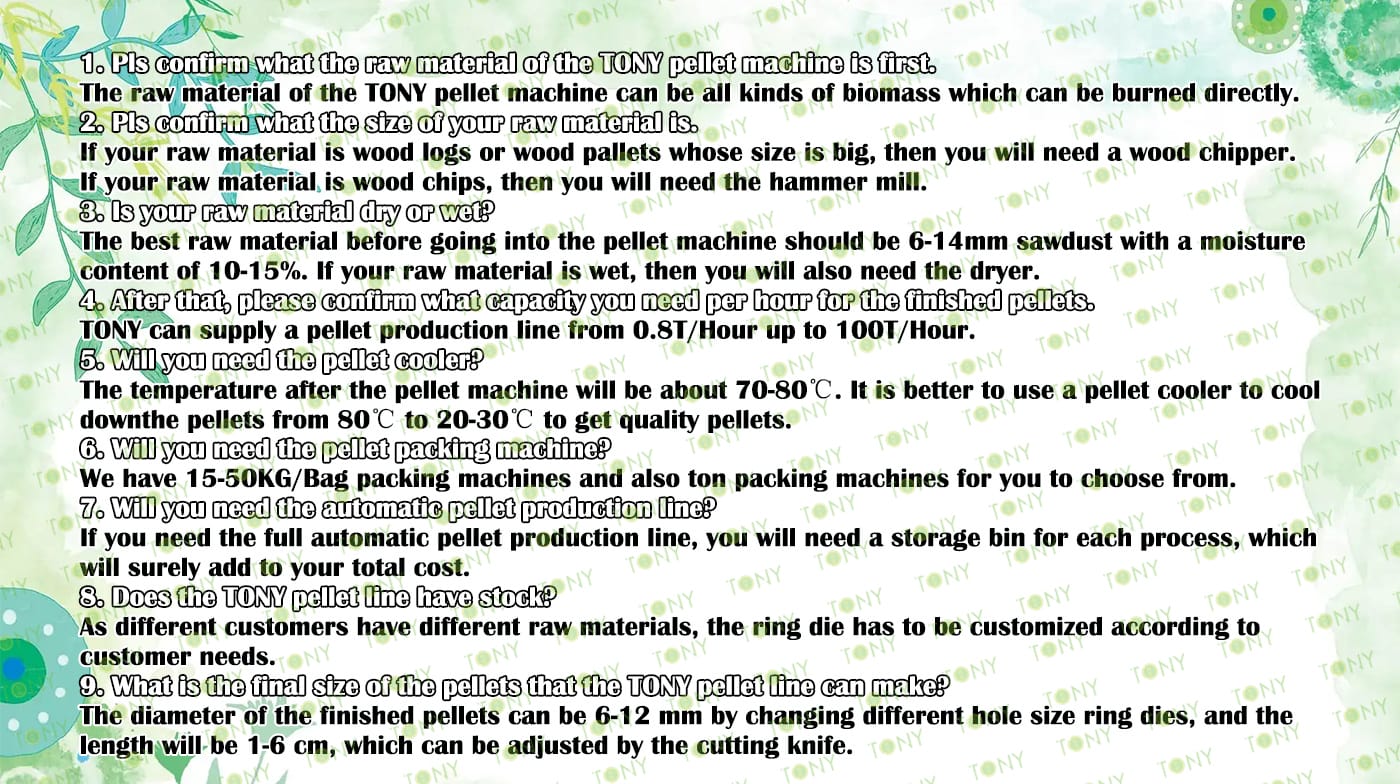 | Next, TONY Will Introduce To You All The Necessary Machinery That Will Be Used For The Whole Pellet Production Line. Some Machines Can Be Custom - Made By Customers According To Different Customers' Detailed Demands. Contact TONY For More Details, Including Quotation And Layout. | ||