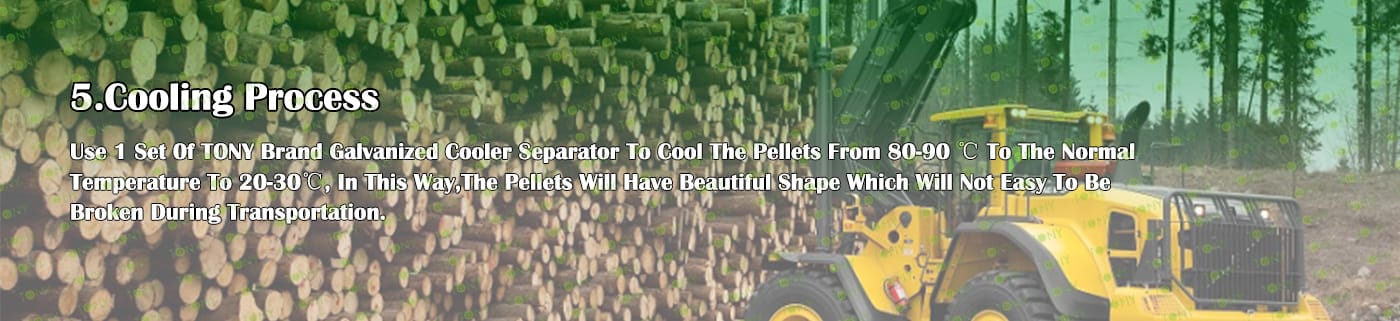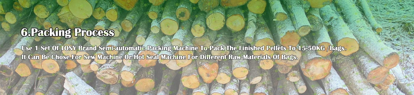 6. Main Equipment: Wood Chipper TPQ216 - 55KW, Effective Hammer Mill-TFD75*100-110KW, Rotary Drum Dryer-1.8*18m, TONY Pellet Machine TYJ860-Ⅲ-250KW, Pellet Cooler, Small Packaging Machine and Belt Conveyors