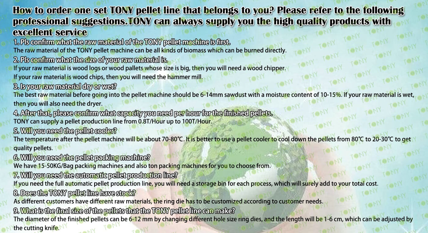 | Next, TONY Will Introduce To You All The Necessary Machinery That Will Be Used For The Whole Pellet Production Line. Some Machines Can Be Custom - Made By Customers According To Different Customers' Detailed Demands. Contact TONY For More Details, Including Quotation And Layout. | ||