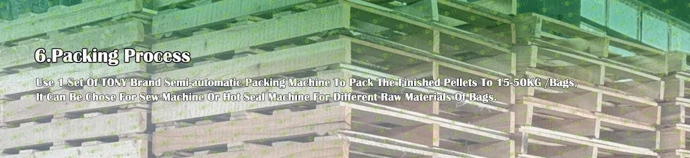 6. Main Equipment: Comprehensive Chipper TPC1000-90KW, Multifunctional Hammer Mill-TFD65*55-37kw, Rotary Drum Dryer-1.2*12m, TONY Pellet Machine TYJ551 - Ⅲ - 90kw, Pellet Cooler, Semi-automatic Packing Machine and Belt Conveyors