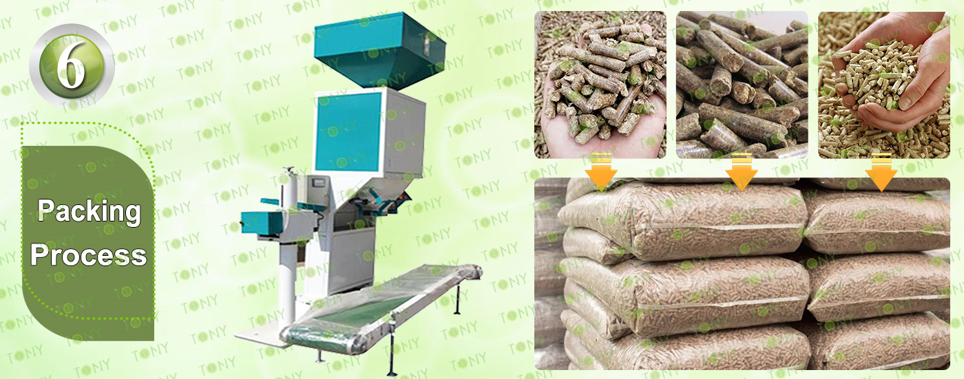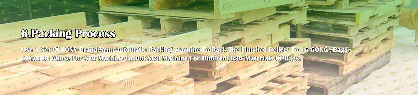 6. Main Equipment: Comprehensive Chipper TPC1000-90KW, Effective Hammer mill-TFD65*55-45kw, Rotary Drum Dryer-1.6*12m, TONY Pellet Machine TYJ551 - Ⅲ - 110kw, Pellet Cooler, Semi-automatic Packing Machine and Belt Conveyors