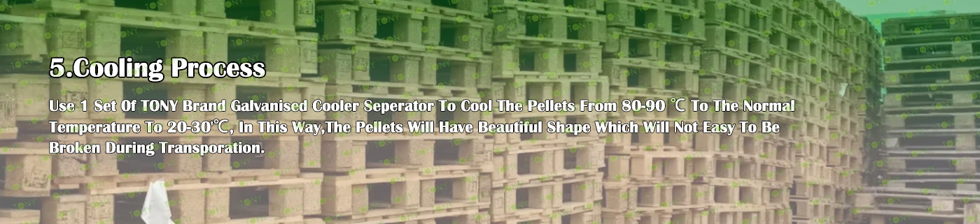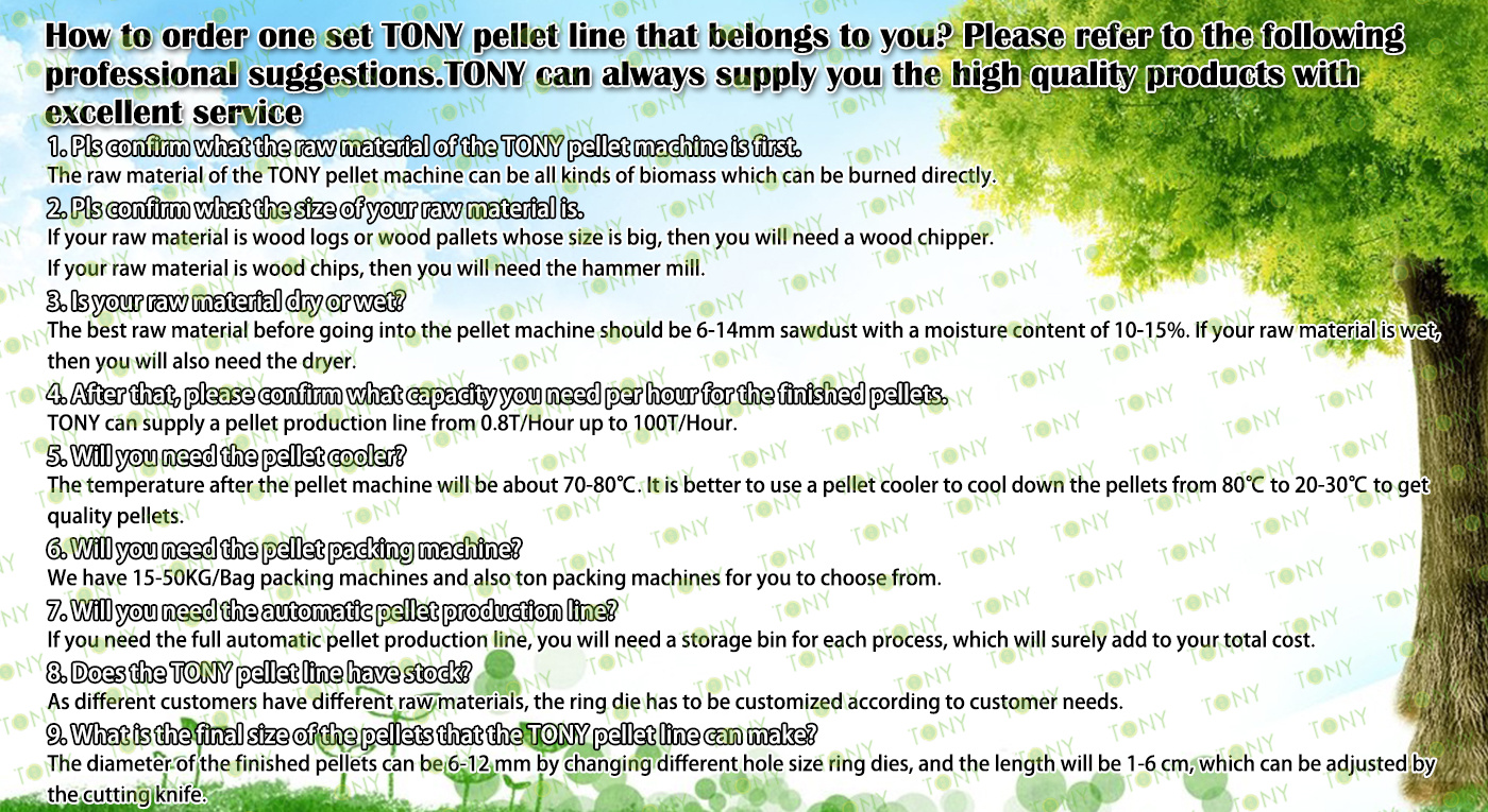 4.Main Machine: Comprehensive Chipper,Hammer Mill, Rotary Drum Dryer,TONY Pellet Machine TYJ551-III-110KW,Pellets Cooler,Packing Machine And Belt Conveyors