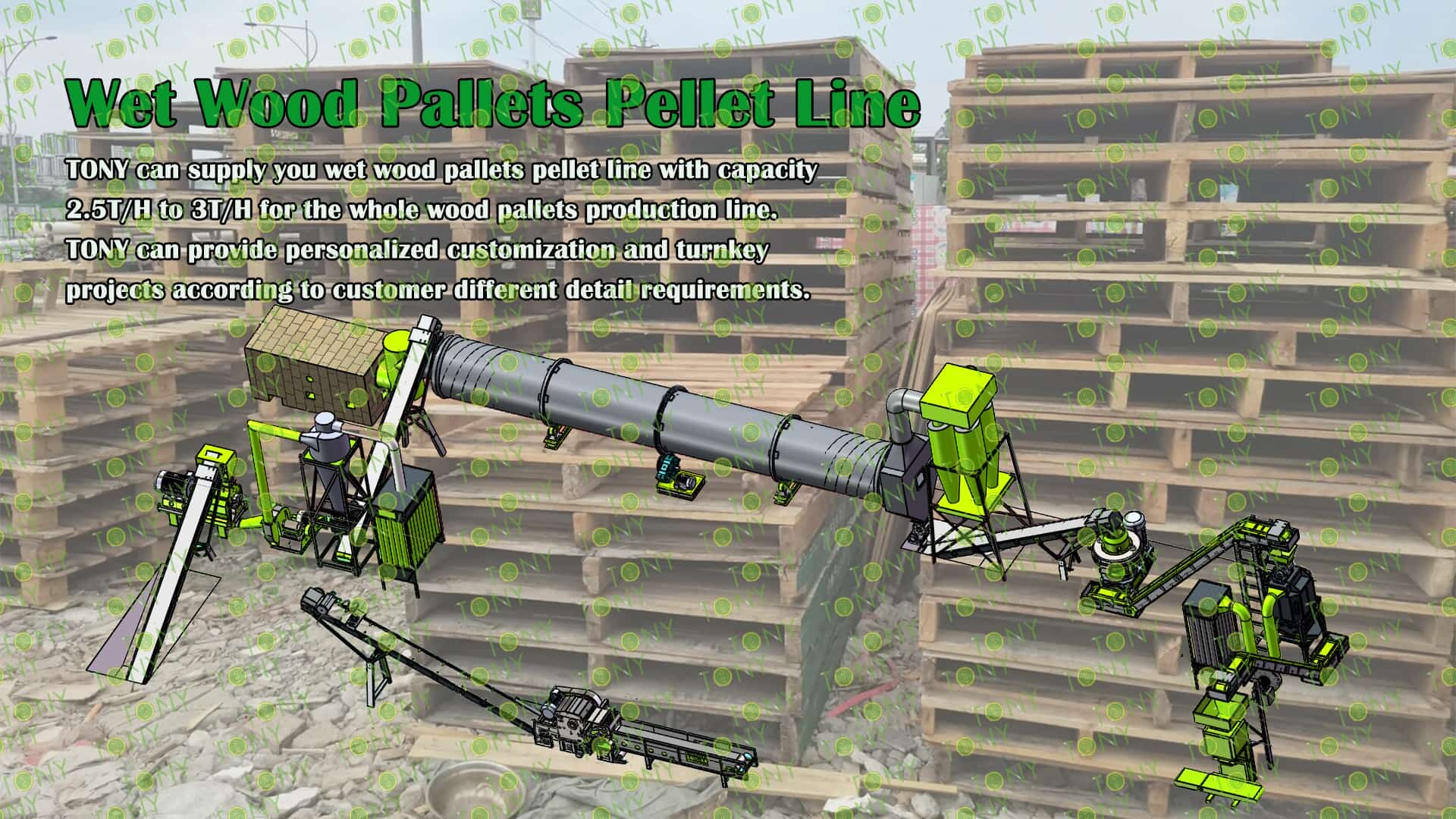3.TONY Brand 2.5-3Ton /Hour Wet Wood Pallets Pellet Line Project Process