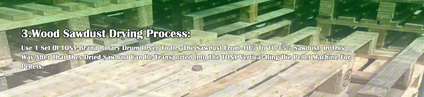 Use 1 Set 0f TONY Brand Rotary Drum Dryer To Dry The Sawdust From 40% To 10-15% Sawdust. In This Way,After That,They Dried Sawdust Can Be Transported Into The TONY Vertical Ring Die Pellet Machine For Pellets.