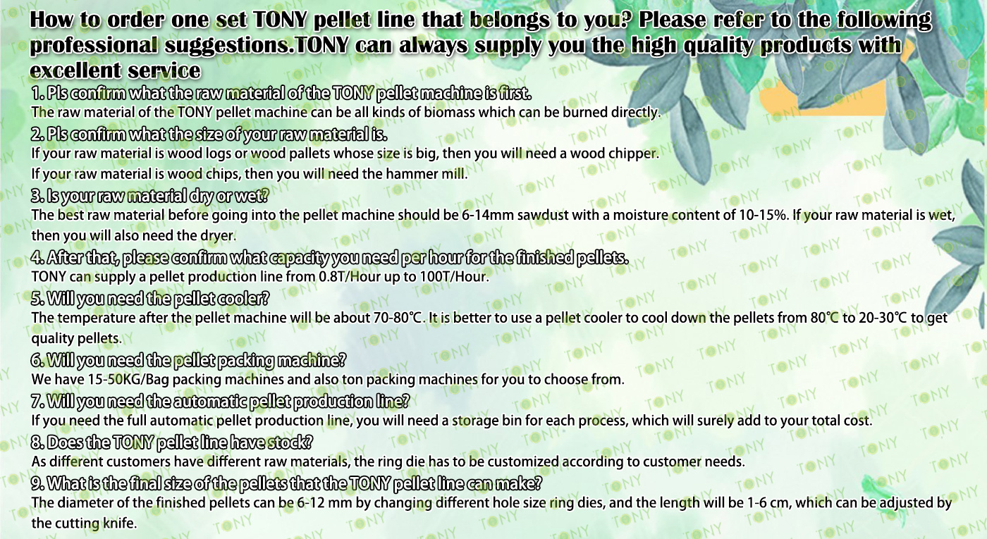 | Next, TONY Will Introduce To You All The Necessary Machinery That Will Be Used For The Whole Pellet Production Line. Some Machines Can Be Custom - Made By Customers According To Different Customers' Detailed Demands. Contact TONY For More Details, Including Quotation And Layout. | ||