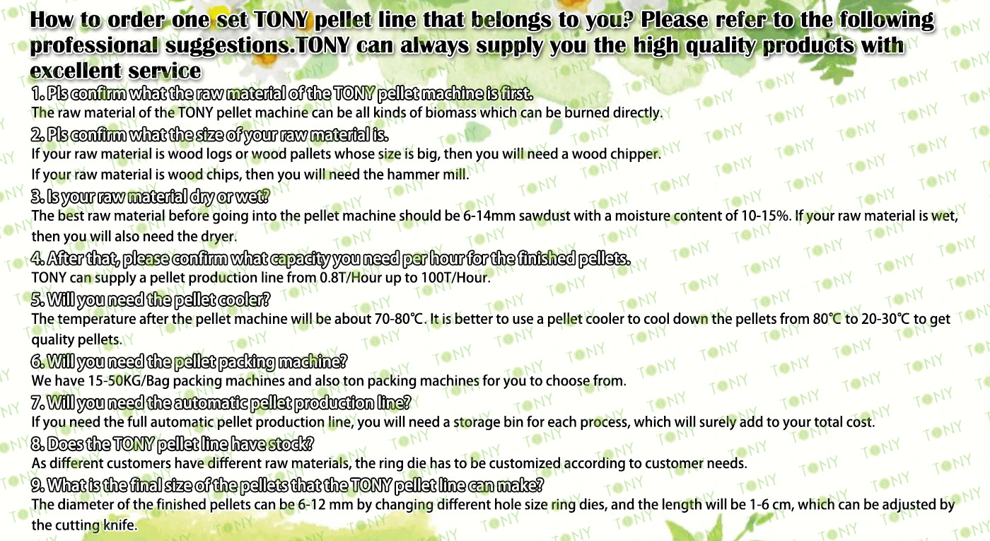| Next, TONY Will Introduce To You All The Necessary Machinery That Will Be Used For The Whole Pellet Production Line. Some Machines Can Be Custom - Made By Customers According To Different Customers' Detailed Demands. Contact TONY For More Details, Including Quotation And Layout. | ||