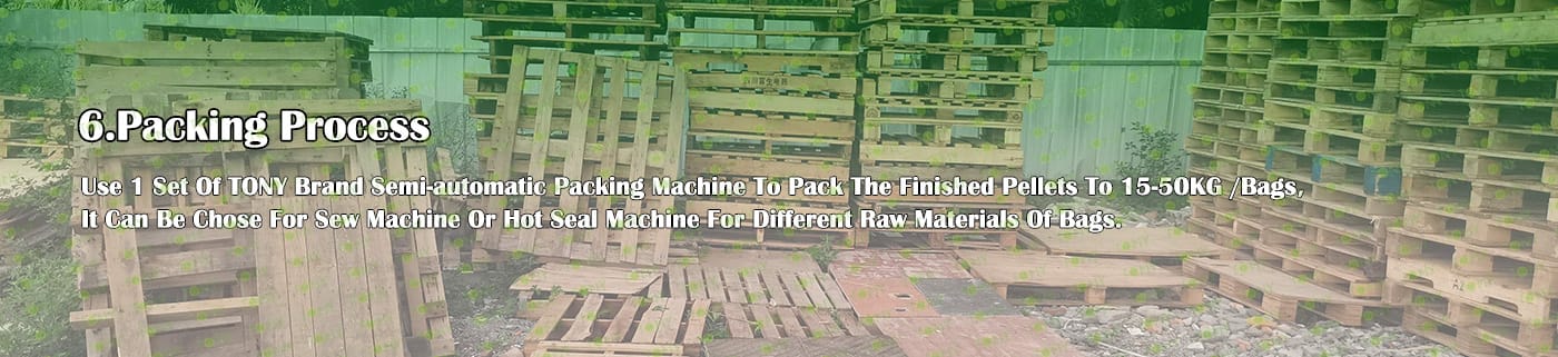 6. Main Equipment: Comprehensive Chipper TPC1000-90KW, Effective Hammer mill-TFD75*100-110kw, Rotary Drum Dryer-1.8*18m, TONY Pellet Machine TYJ860 - Ⅲ - 250kw, Pellet Cooler, Semi-automatic Packing Machine and Belt Conveyors