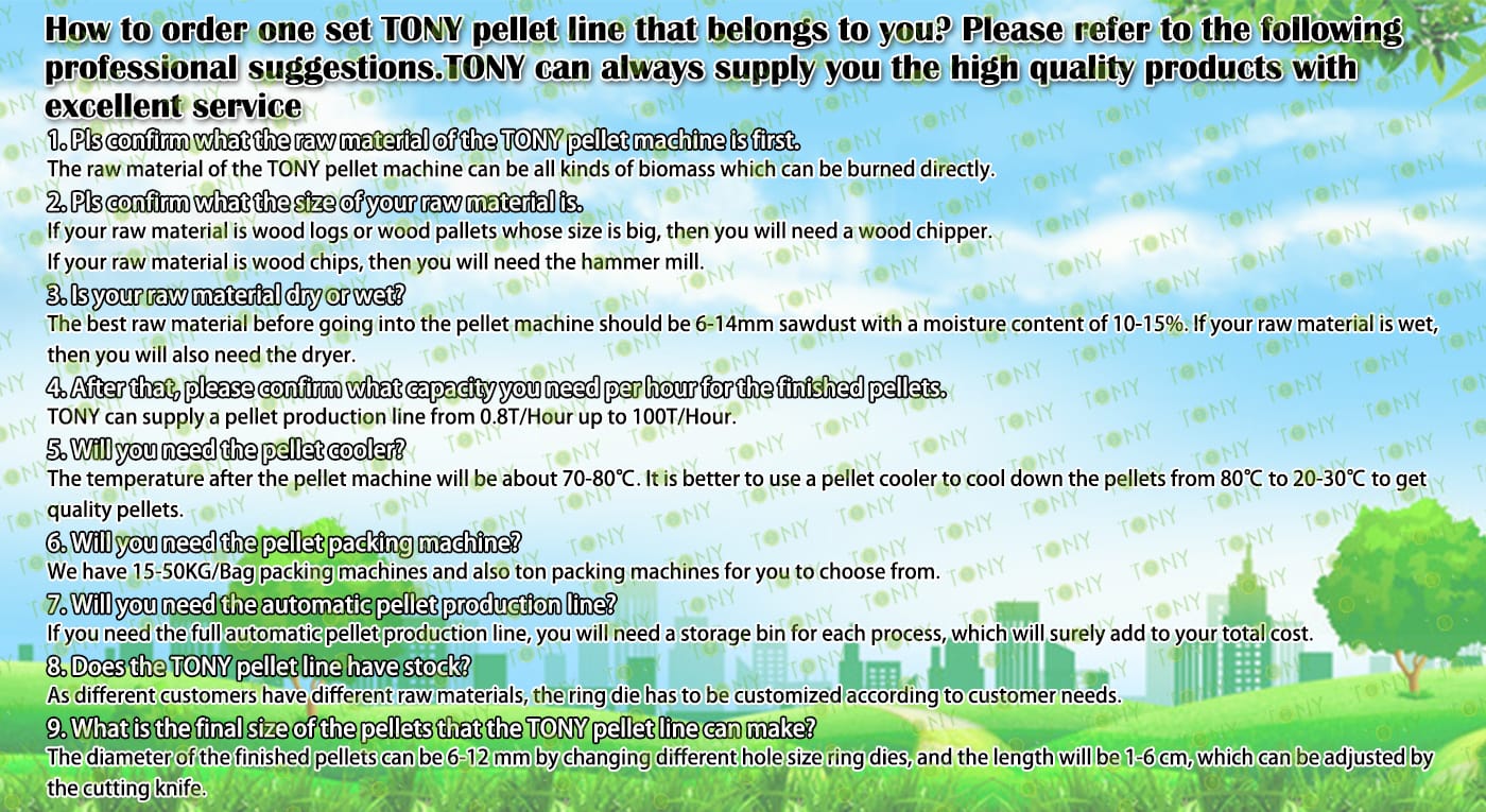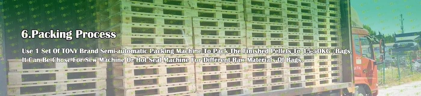6. Main Equipment: Comprehensive Chipper TPC1000-90KW, Effective Hammer Mill-TFD75*132-132kw, Rotary Drum Dryer-1.8*20m, TONY Pellet Machine TYJ860 - Ⅲ - 280kw, Pellet Cooler, Semi-automatic Packing Machine and Belt Conveyors
