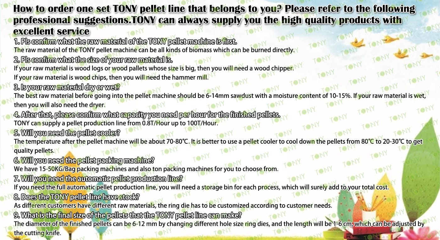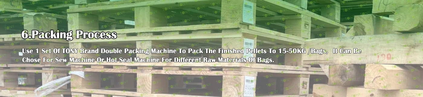 6. Main Equipment: Comprehensive Chipper TPC1000-90KW, Dual Shaft Hammer Mill--TFS65*100-110*2kw, Rotary Drum Dryer-1.8*24m, TONY Pellet Machine TYJ760 - Ⅲ -185kw, Pellet Cooler, Double Packing Machine and Belt Conveyors