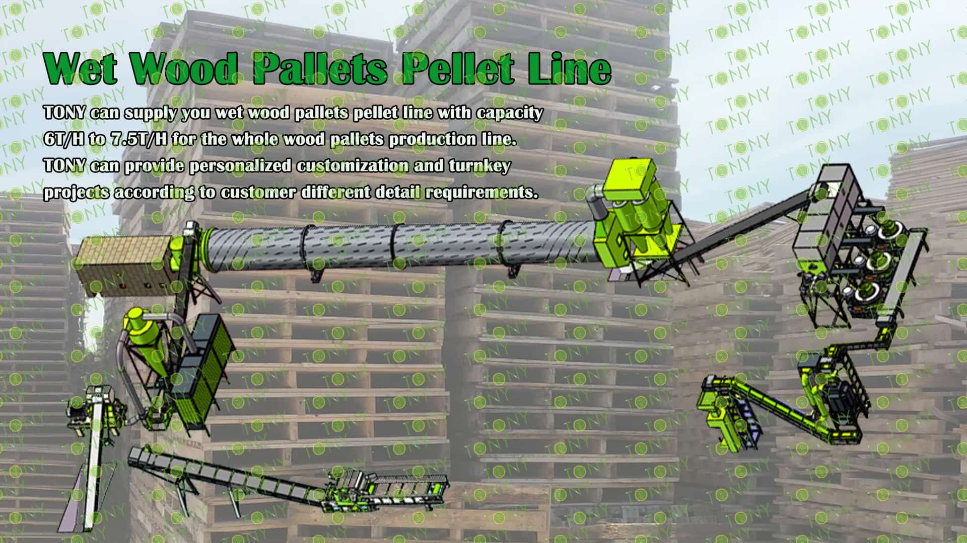 3.TONY Brand 6-7.5Ton /Hour Wet Wood Pallets Pellet Line Project Process