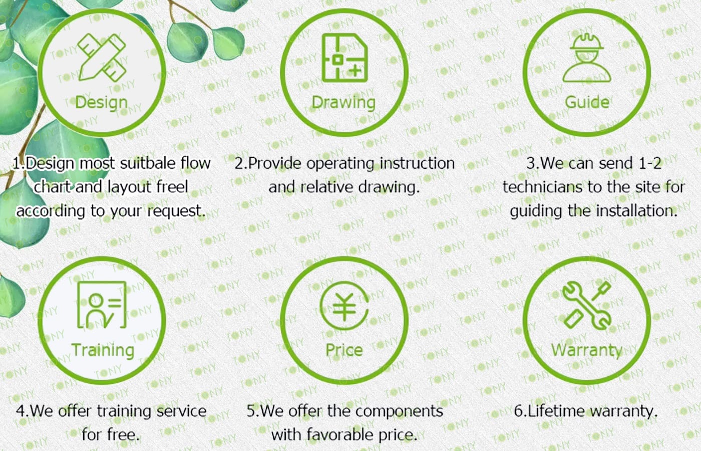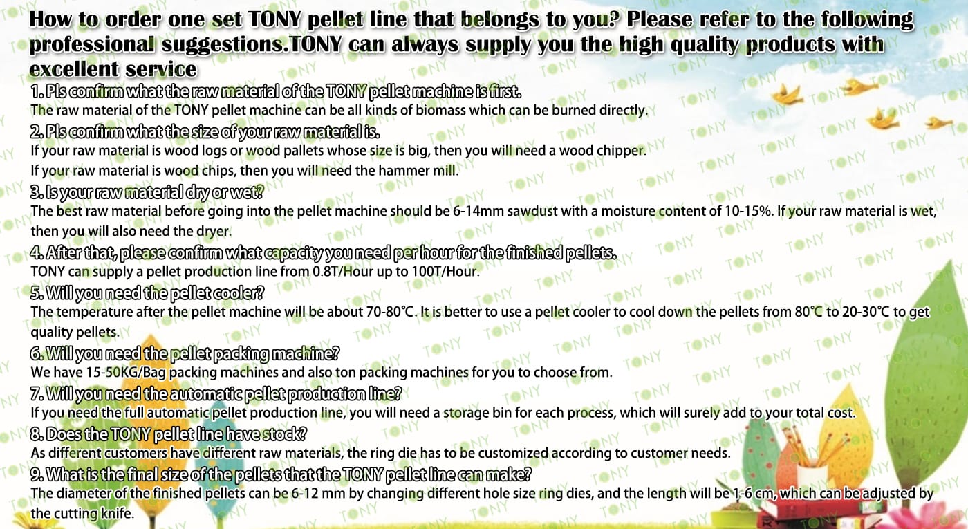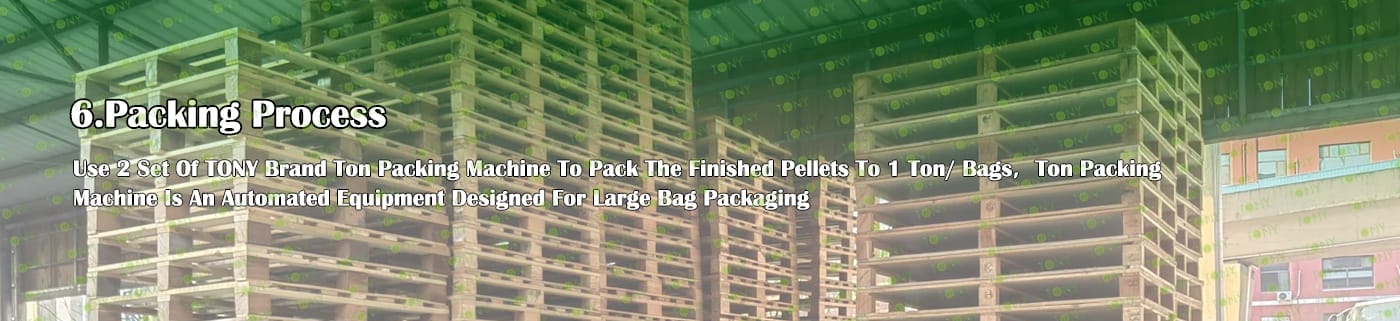6. Main Equipment: Comprehensive Chipper TPC1400-600-200KW, Effective Hammer Mill-TFD85*220-220KW, Rotary Drum Dryer-2*24m, TONY Pellet Machine TYJ860-Ⅲ-220KW, Pellet Cooler, Ton Packing Machine and Belt Conveyors