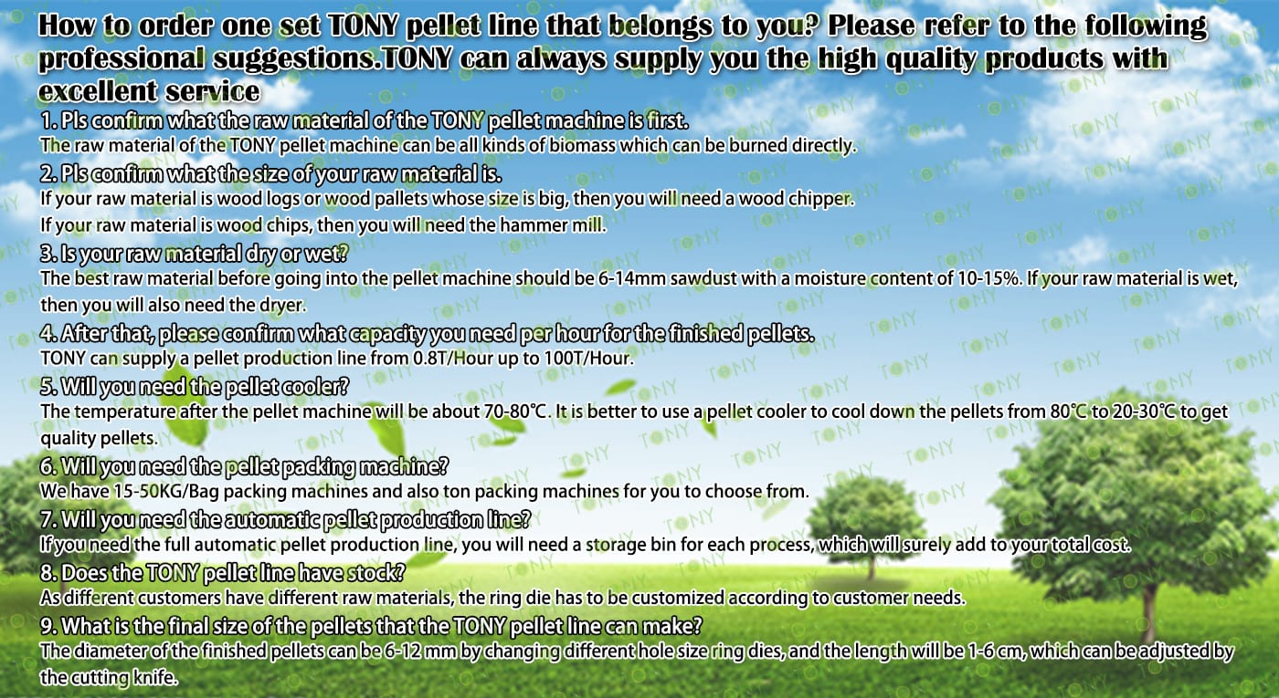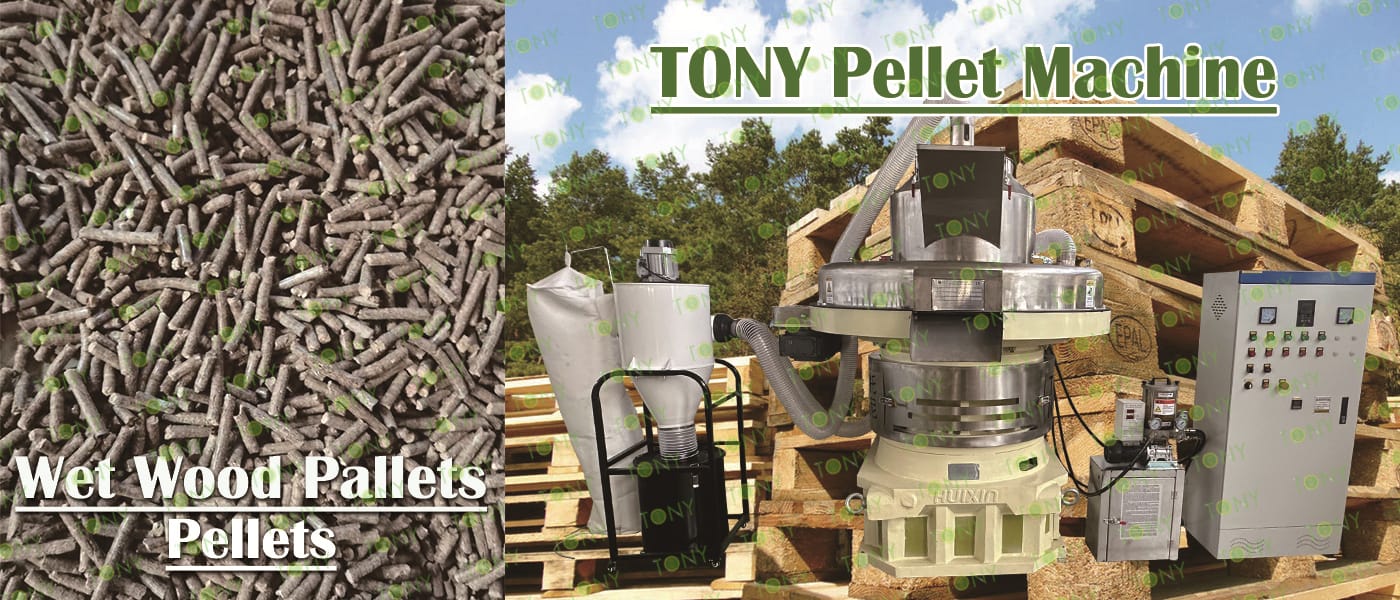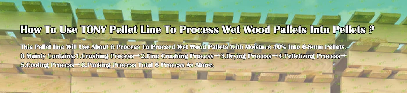 How to use the TONY pellet production line to make pellets from wet wood pallets? The process mainly includes the following steps and equipment: 1. Use TONY comprehensive chipper to grind wet wood pallets with width 1.4m into wood chips 25 - 55 mm in length. 2. Use TONY effective hammer mill to crush the 25-55 mm wood chips into 8-14 mm sawdust. 3. Use TONY rotary drum dryer to dry the sawdust with a 40% moisture content down to a moisture content of 10%-15%. 4. Use TONY vertical ring die pellet machine to produce pellets with a diameter of 6-8 mm. 5. Use TONY galvanized cooler to cool the pellets from 80-90°C to 20-30°C. 6. Use TONY ton packing machine to pack the pellets into bags, each weighing 1 ton. For more detailed information and quotations, you can contact TONY. TONY can provide all the above - mentioned products at highly competitive prices and with excellent quality. |