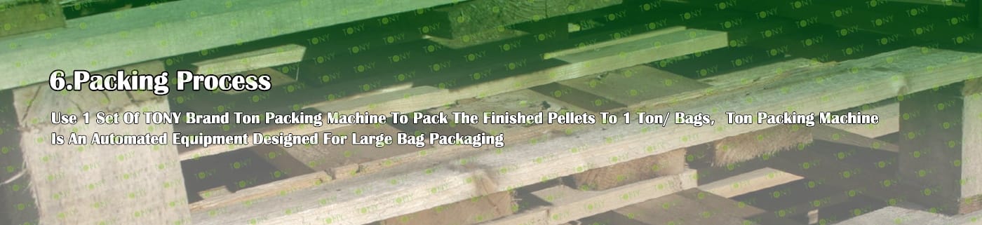 6. Main Equipment: Comprehensive Chipper TPC1400-700-250KW, Effective Hammer Mill-TFD85*220-220KW,Rotary Drum Dryer-2.2*24m, TONY Pellet Machine TYJ760-Ⅲ-185KW, Pellet Cooler, Ton Packing Machine and Belt Conveyors