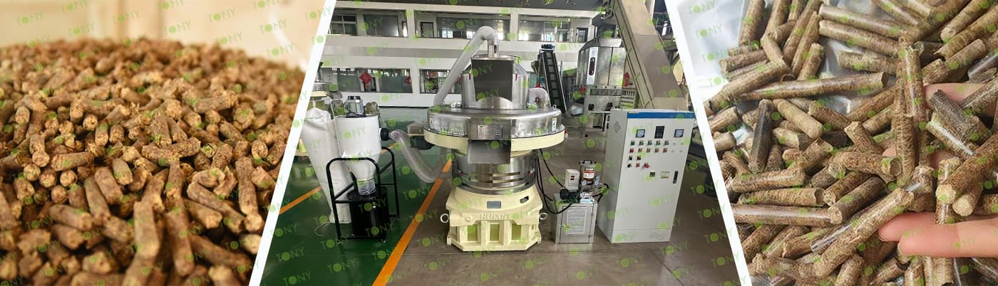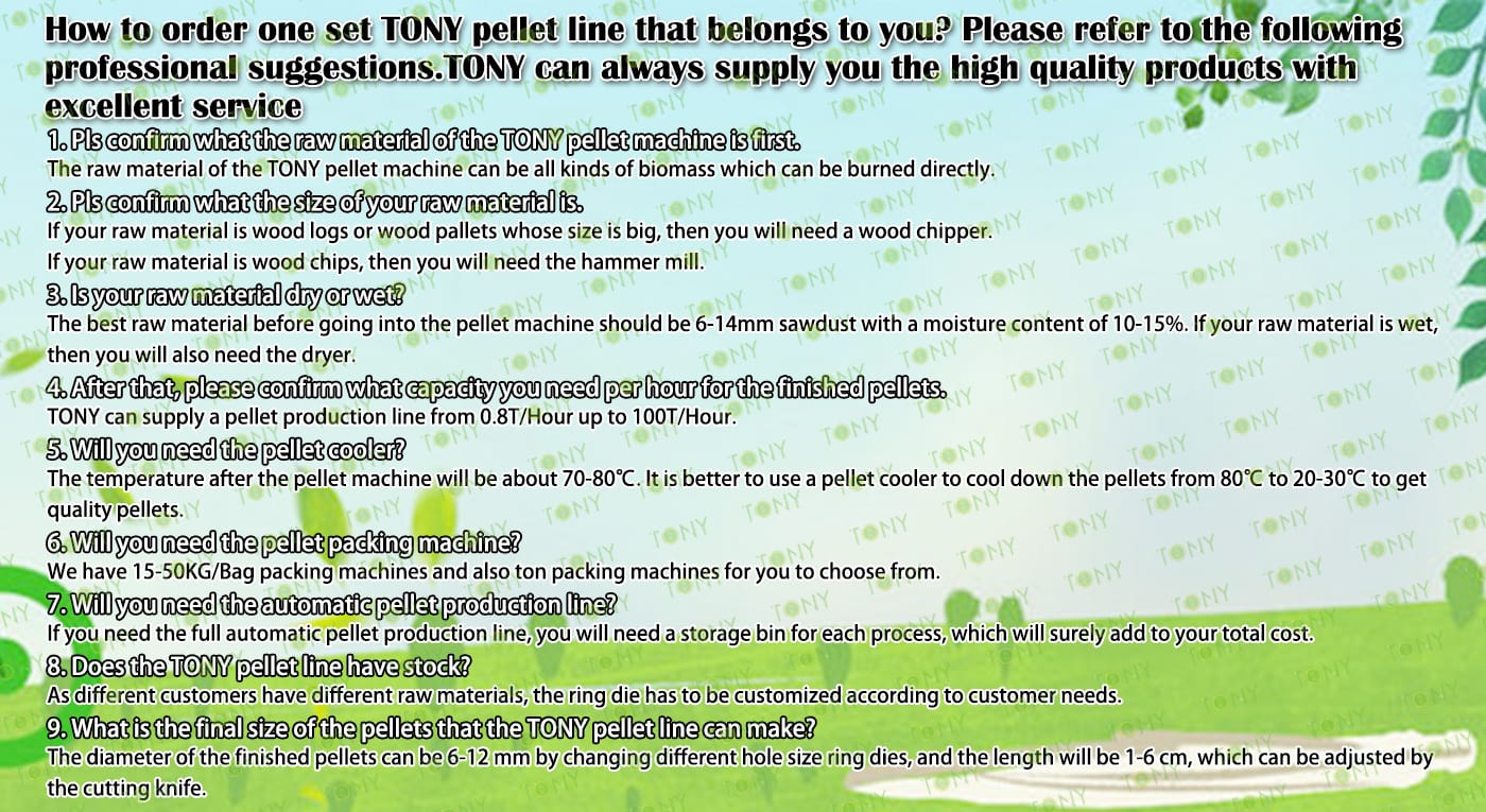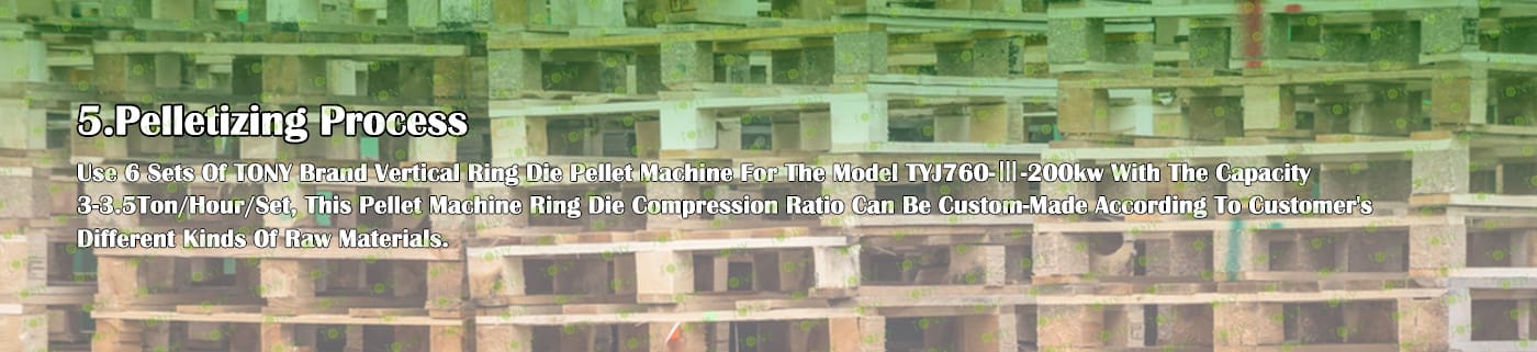 4.Main Machine: Comprehensive Chipper,Hammer Mill,Large Hydraulic Storage Silo, Rotary Drum Dryer,TONY Pellet Machine TYJ760-Ⅲ-200KW,Pellets Cooler,Packing Machine And Belt Conveyors