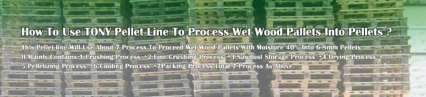 How to use the TONY pellet production line to make pellets from wet wood pallets? The process mainly includes the following steps and equipment: 1. Use TONY comprehensive chipper to grind wet wood pallets with width 1.3m into wood chips 25 - 55 mm in length. 2. Use TONY effective hammer mill to crush the 25-55 mm wood chips into 8-14 mm sawdust. 3.Use TONY large hydraulic storage silo to storage 8-14 mm sawdust 4. Use TONY rotary drum dryer to dry the sawdust with a 40% moisture content down to a moisture content of 10%-15%. 5. Use TONY vertical ring die pellet machine to produce pellets with a diameter of 6-8 mm. 6. Use TONY galvanized cooler to cool the pellets from 80-90°C to 20-30°C. 7. Use TONY ton packing machine to pack the pellets into bags, each weighing 1 ton. For more detailed information and quotations, you can contact TONY. TONY can provide all the above - mentioned products at highly competitive prices and with excellent quality. |
