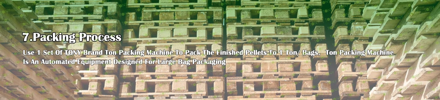 6. Main Equipment: Comprehensive Chipper TPC1300-600-132KW, Effective Hammer Mill-TFD75*132-132KW, TONY Large Hydraulic Storage Silo,Rotary Drum Dryer-2.8*24m, TONY Pellet Machine TYJ760-Ⅲ -200KW, Pellet Cooler, Ton Packing Machine and Belt Conveyors