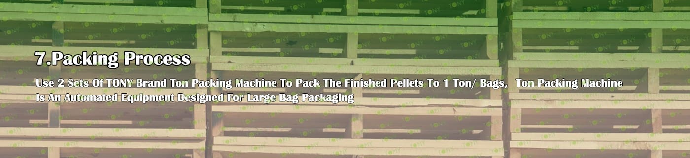 6. Main Equipment: Comprehensive Chipper TPC1300-600-160KW, Effective Hammer Mill-TFD75*132-132KW, TONY Large Hydraulic Storage Silo,Rotary Drum Dryer-3*24m, TONY Pellet Machine TYJ860-Ⅲ-280KW, Pellet Cooler, Ton Packing Machine and Belt Conveyors