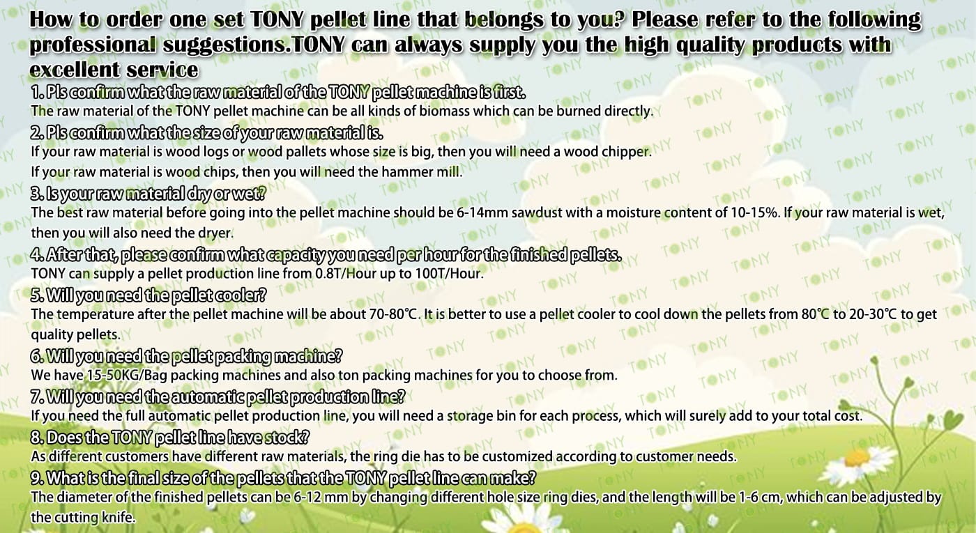 4.Main Machine: Comprehensive Chipper,Hammer Mill,Large Hydraulic Storage Silo, Rotary Drum Dryer,TONY Pellet Machine TYJ860-Ⅲ-280KW,Pellets Cooler,Packing Machine And Belt Conveyors