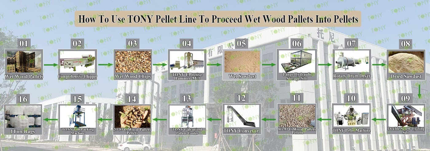 How to use the TONY pellet production line to make pellets from wet wood pallets? The process mainly includes the following steps and equipment: 1. Use TONY comprehensive chipper to grind wet wood pallets with width 1.8m into wood chips 25 - 55 mm in length. 2. Use TONY effective hammer mill to crush the 25-55 mm wood chips into 8-14 mm sawdust. 3.Use TONY large hydraulic storage silo to storage 8-14 mm sawdust 4. Use TONY rotary drum dryer to dry the sawdust with a 40% moisture content down to a moisture content of 10%-15%. 5. Use TONY vertical ring die pellet machine to produce pellets with a diameter of 6-8 mm. 6. Use TONY galvanized cooler to cool the pellets from 80-90°C to 20-30°C. 7. Use TONY ton packing machine to pack the pellets into bags, each weighing 1 ton. For more detailed information and quotations, you can contact TONY. TONY can provide all the above - mentioned products at highly competitive prices and with excellent quality. |