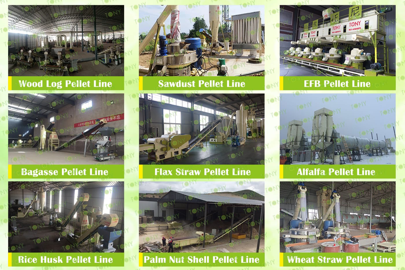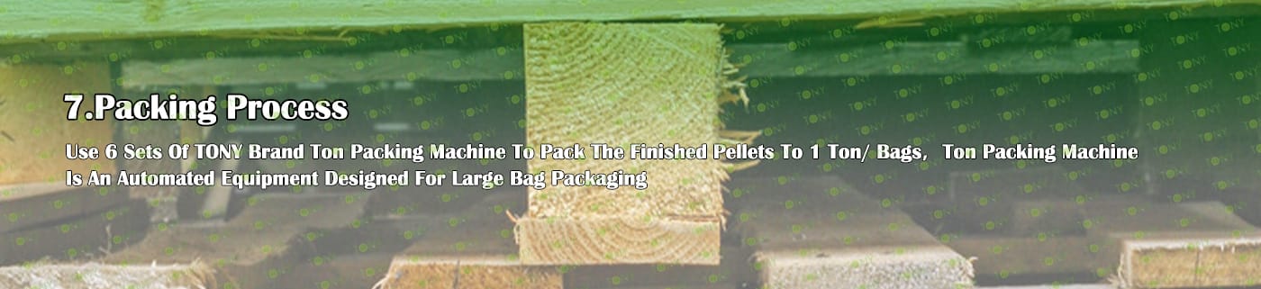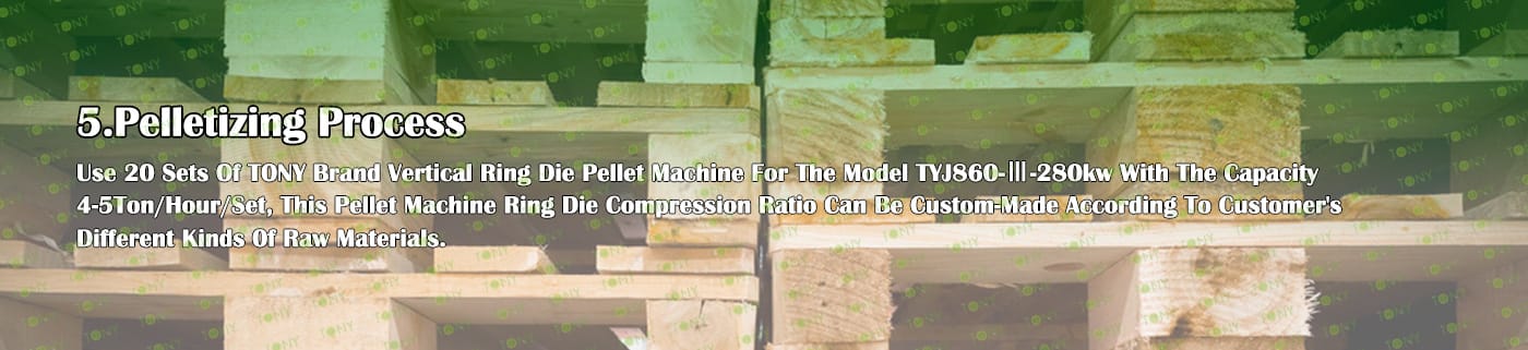 6. Main Equipment: Comprehensive Chipper TPC1800-500KW, Effective Hammer Mill-TFD1600-500KW, TONY Large Hydraulic Storage Silo,Rotary Drum Dryer-3.5*28m, TONY Pellet Machine TYJ860-Ⅲ-280KW, Pellet Cooler, Ton Packing Machine and Belt Conveyors
