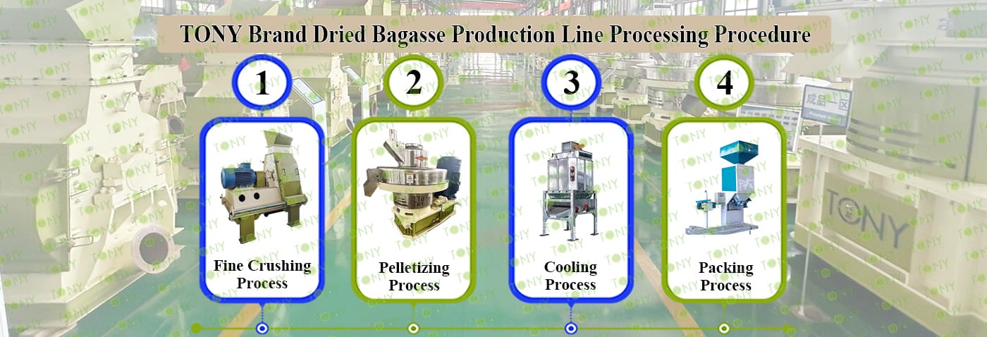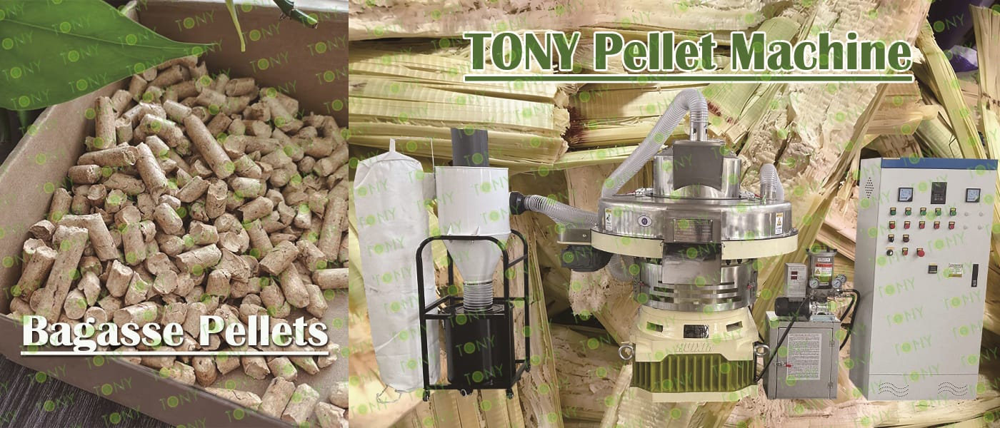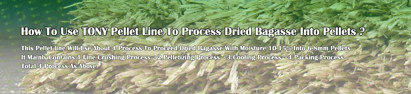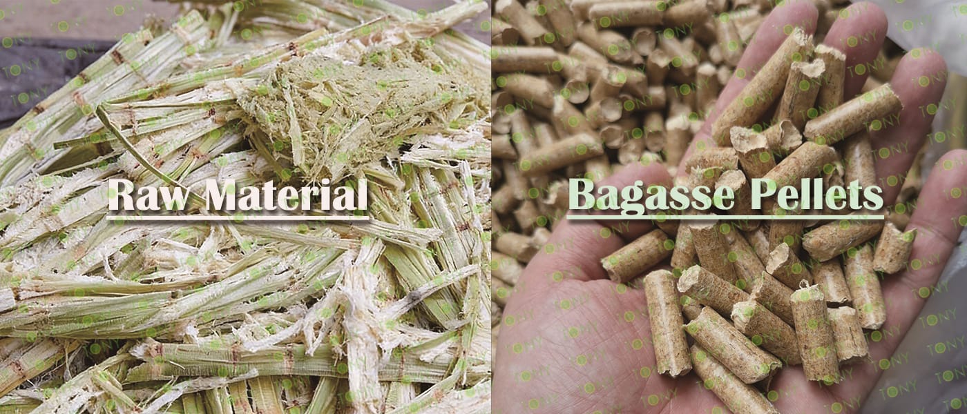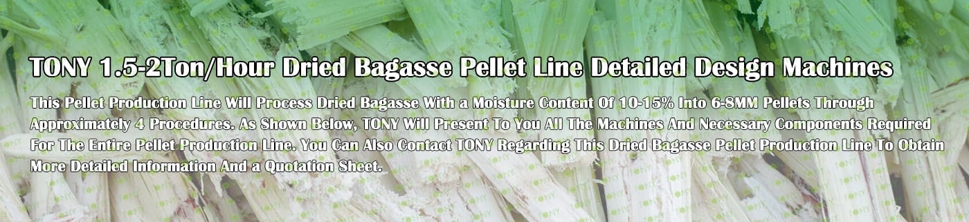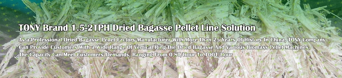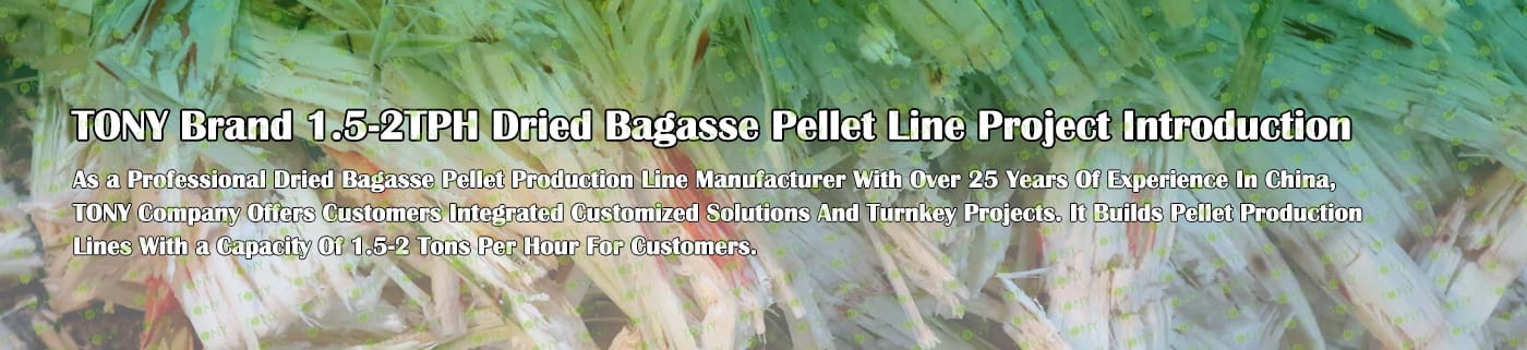 Заводът за производство на пелети от суха багаса с марка TONY 1,5-2 тона/час може да използва изсушена багаса като основна суровина. След предварителна обработка и обработка, той се втвърдява в пелетно гориво Bagasse с висока плътност. Това гориво е идеален заместител на въглищата и петрола и играе роля в енергоспестяването и намаляването на емисиите. Понастоящем той се използва широко в региони, богати на ресурси от багаса.