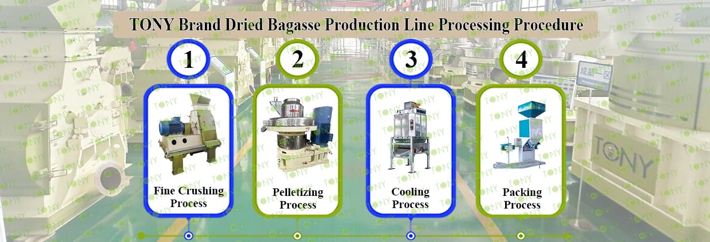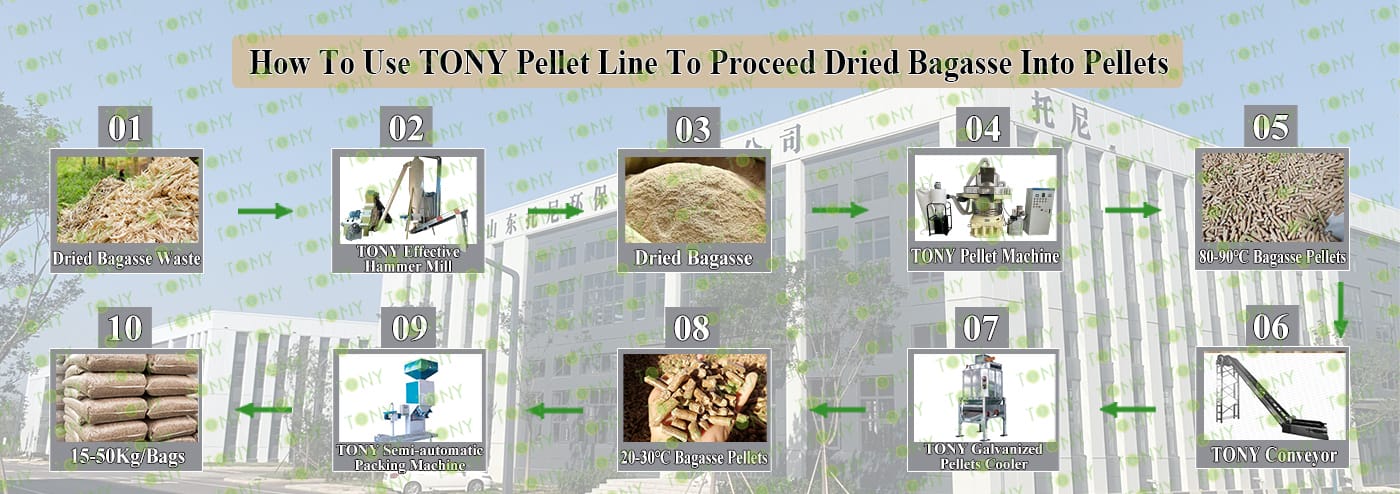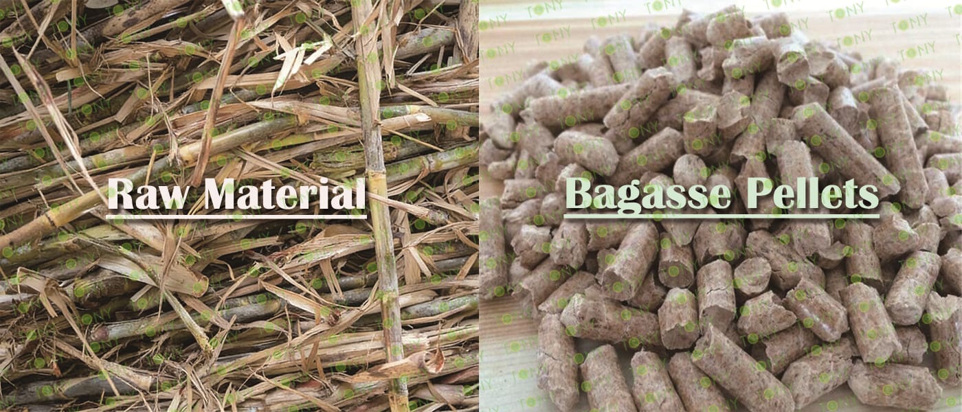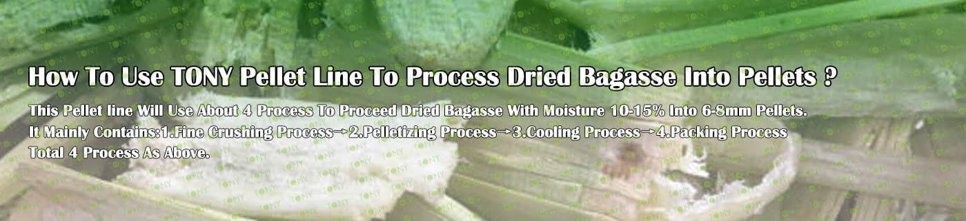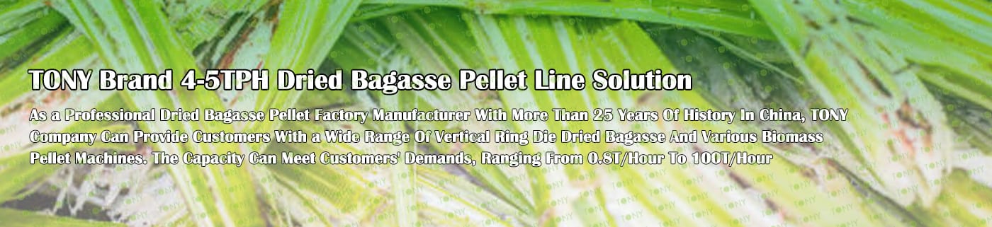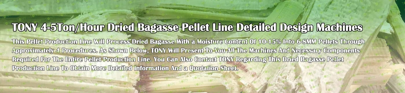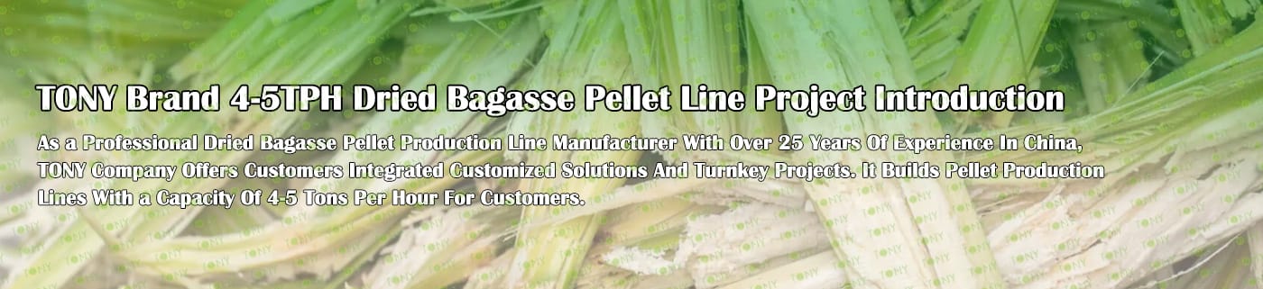 Заводът за производство на пелети от сушена багаса с марка TONY 4-5 тона/час може да използва сушена багаса като основна суровина. След предварителна обработка и обработка, той се втвърдява в пелетно гориво Bagasse с висока плътност. Това гориво е идеален заместител на въглищата и петрола и играе роля в енергоспестяването и намаляването на емисиите. Понастоящем той се използва широко в региони, богати на ресурси от багаса.