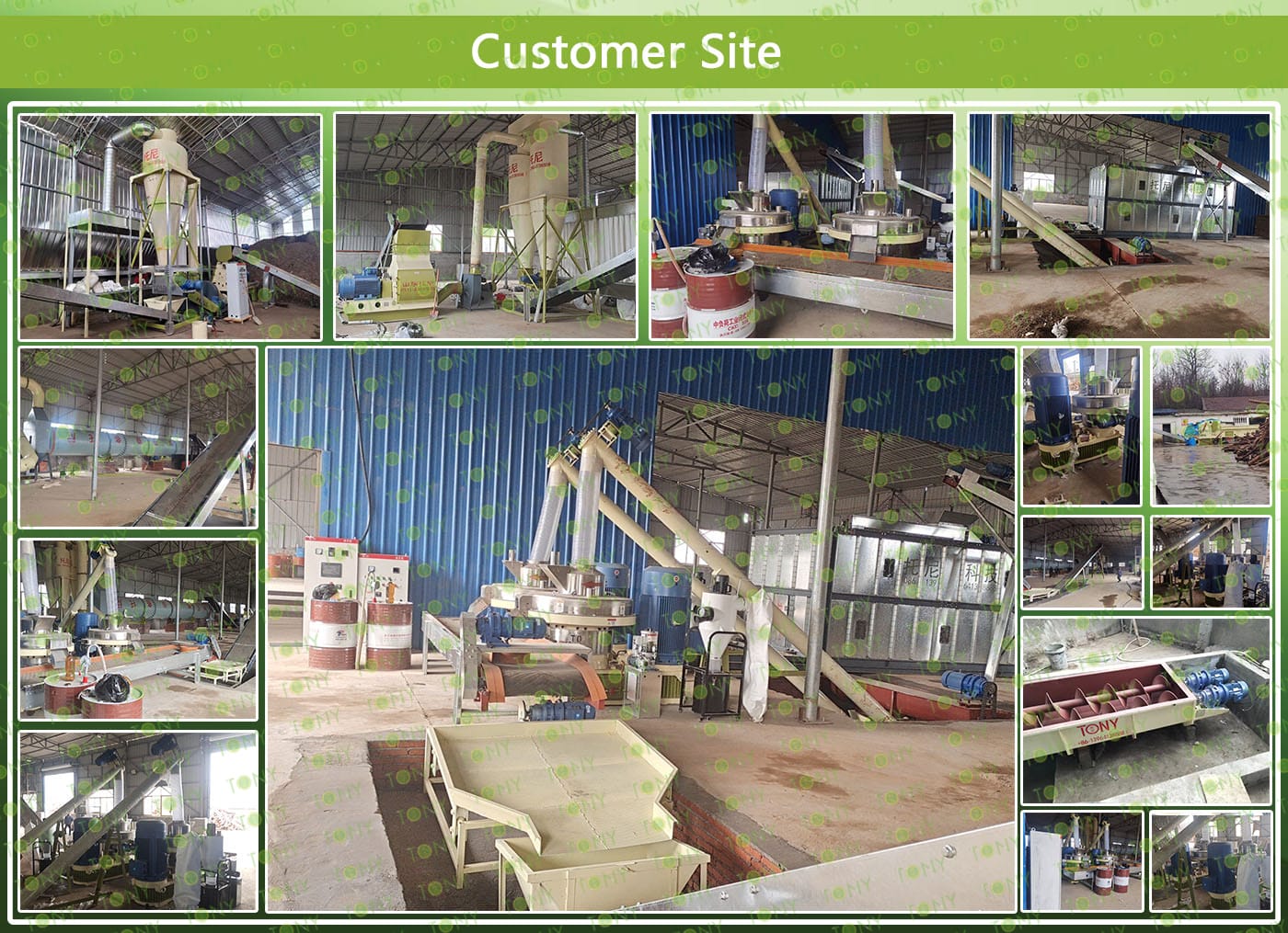6. Основно оборудване: Ефективна чукова мелница-TFD75*132-132KW, машина за пелети TONY- TYJ860-Ⅲ-280KW охладител за поцинковани пелети, полуавтоматична машина за опаковане и лентови транспортьори