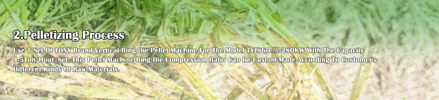 4. Основна машина: чукова мелница, машина за пелети TONY TYJ860-III-280KW, охладител за пелети, опаковъчна машина и лентови транспортьори