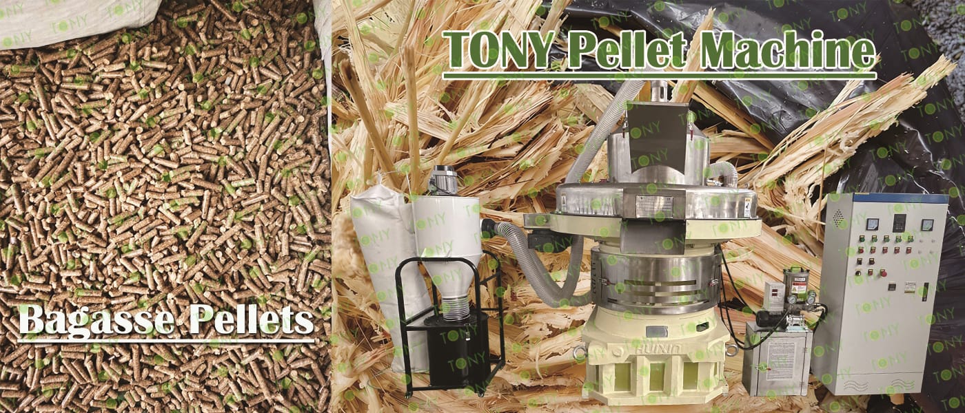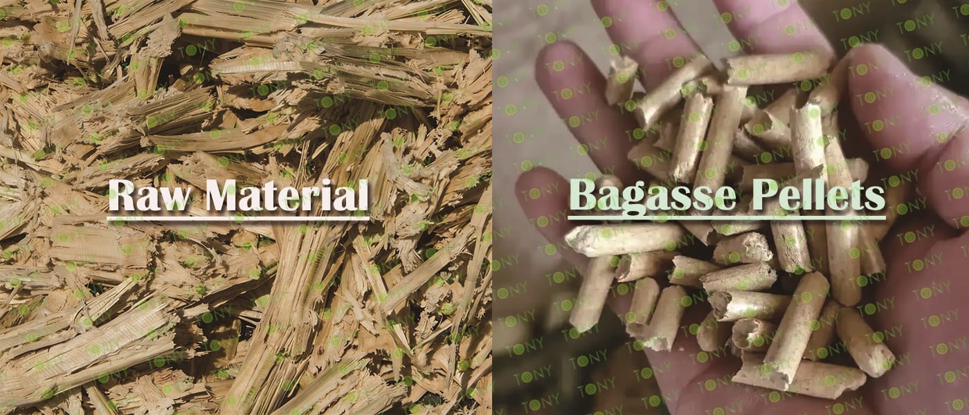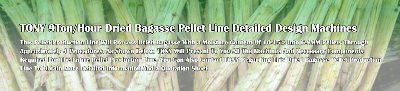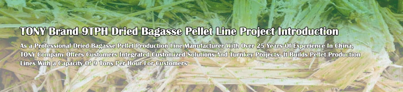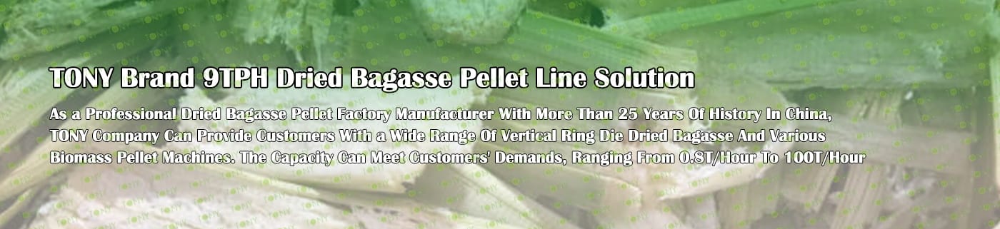 Заводът за производство на пелети от суха багаса с марка TONY 9 тона/час може да използва изсушена багаса като основна суровина. След предварителна обработка и обработка, той се втвърдява в пелетно гориво Bagasse с висока плътност. Това гориво е идеален заместител на въглищата и петрола и играе роля в енергоспестяването и намаляването на емисиите. Понастоящем той се използва широко в региони, богати на ресурси от багаса.