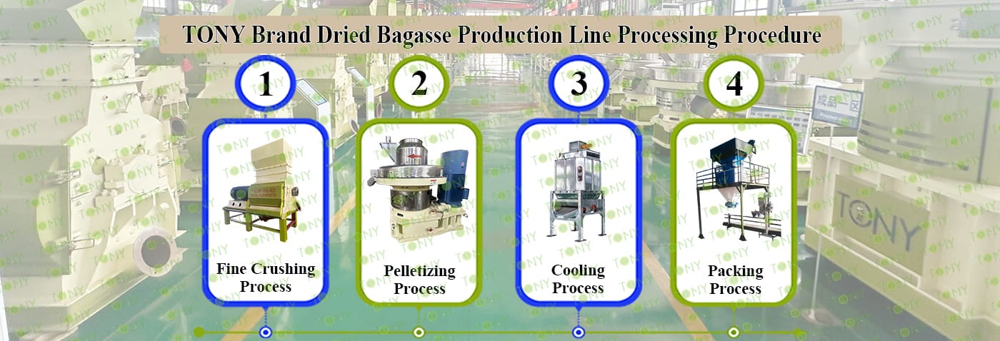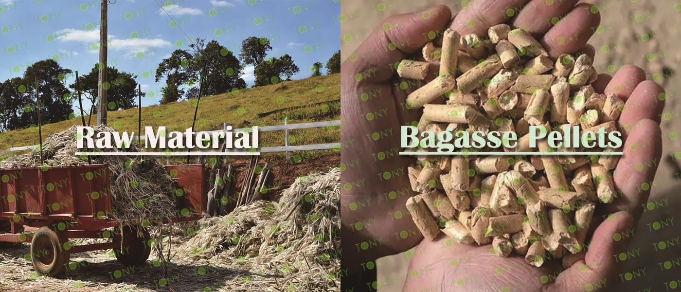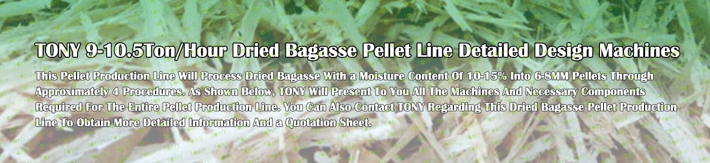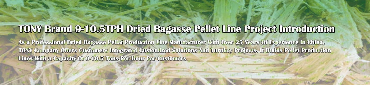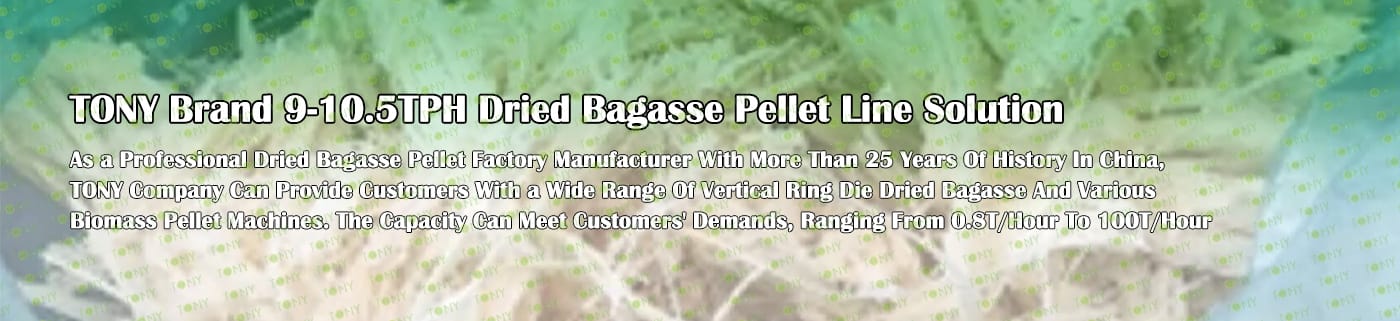 Заводът за производство на пелети от сушена багаса с марка TONY 9-10,5 тона/час може да използва сушена багаса като основна суровина. След предварителна обработка и обработка, той се втвърдява в пелетно гориво Bagasse с висока плътност. Това гориво е идеален заместител на въглищата и петрола и играе роля в енергоспестяването и намаляването на емисиите. Понастоящем той се използва широко в региони, богати на ресурси от багаса.