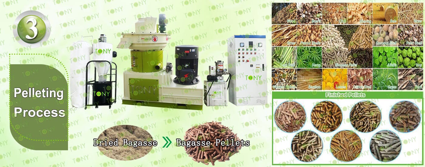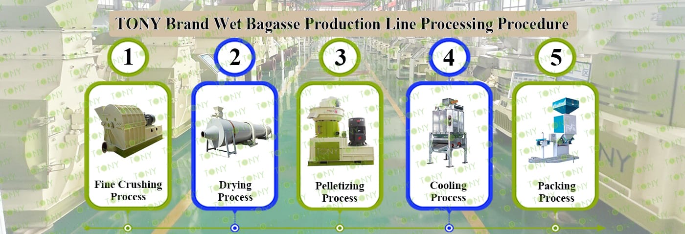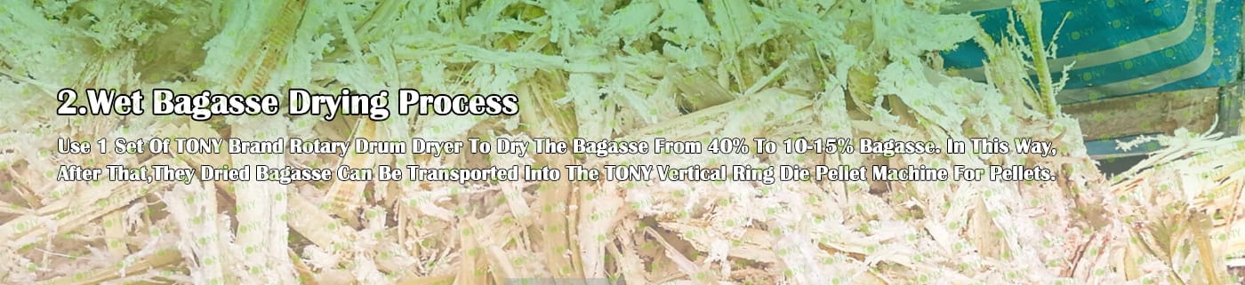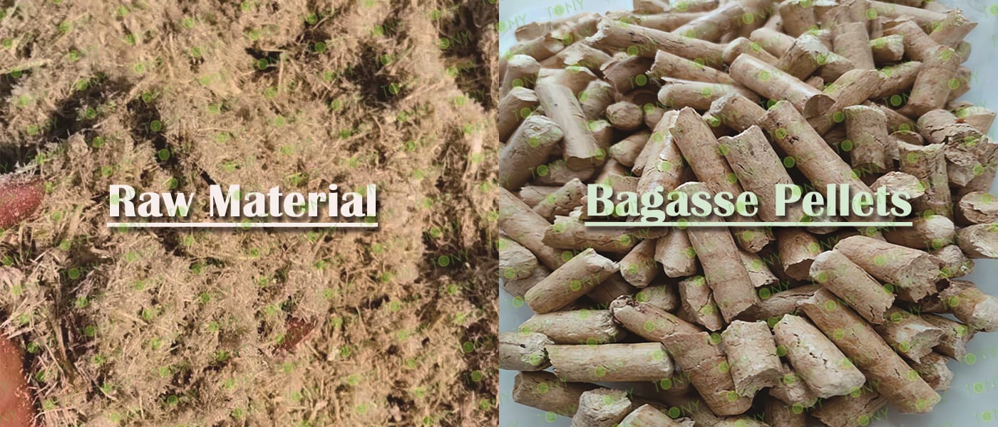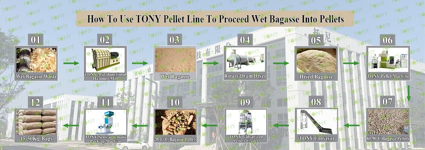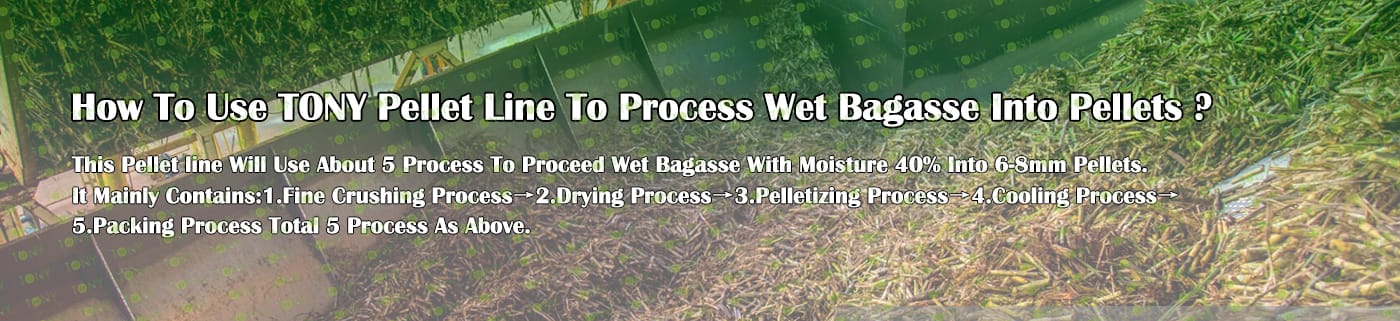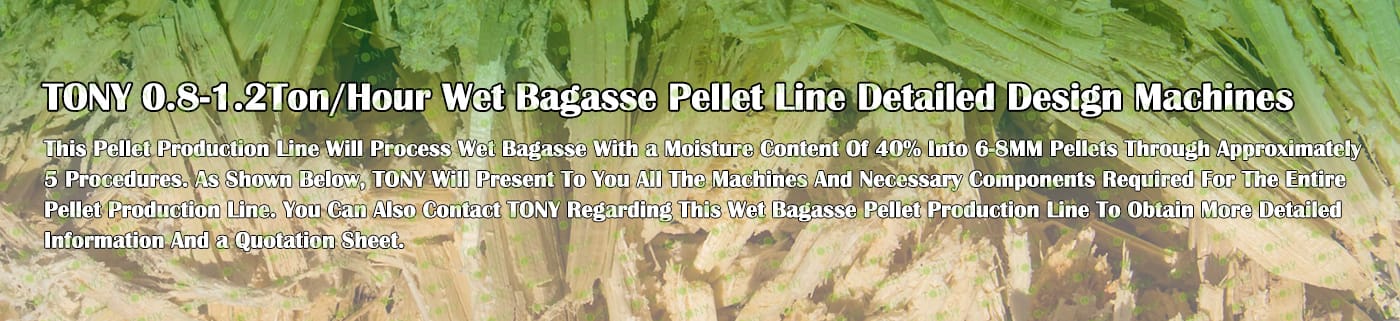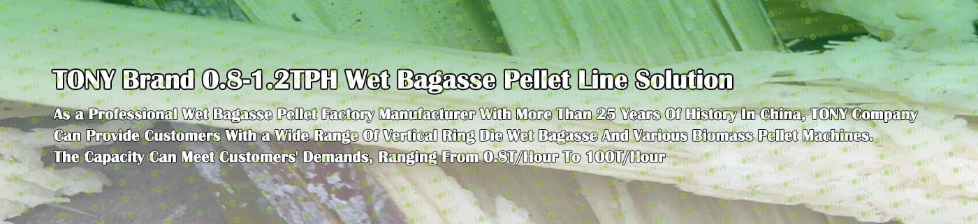 Заводът за производство на пелети за мокра багаса с марка TONY 0,8-1,2 тона/час може да използва мокра багаса като основна суровина. След предварителна обработка и обработка, той се втвърдява в пелетно гориво Bagasse с висока плътност. Това гориво е идеален заместител на въглищата и петрола и играе роля в енергоспестяването и намаляването на емисиите. Понастоящем той се използва широко в региони, богати на ресурси от багаса.